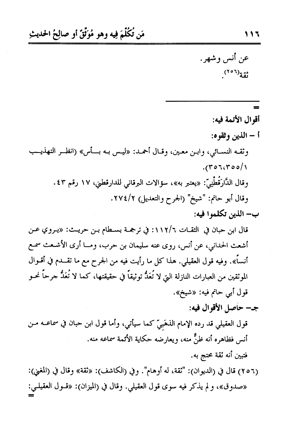 1 قال في الديوان: "ثقة، له أوهام". وفي الكاشف: «ثقة» وقال في المغني: «صدوق» ، ولم يذكر فيه سوى قول العقيلي. وقال في الميزان: «قول العقيلي: «في حديثه وهم» ليس بمسَلِّم إليه، وأنا أتعجب كيف لم يخرج له البخاري ومسلم» ، ورمز للعمل على توثيقه.