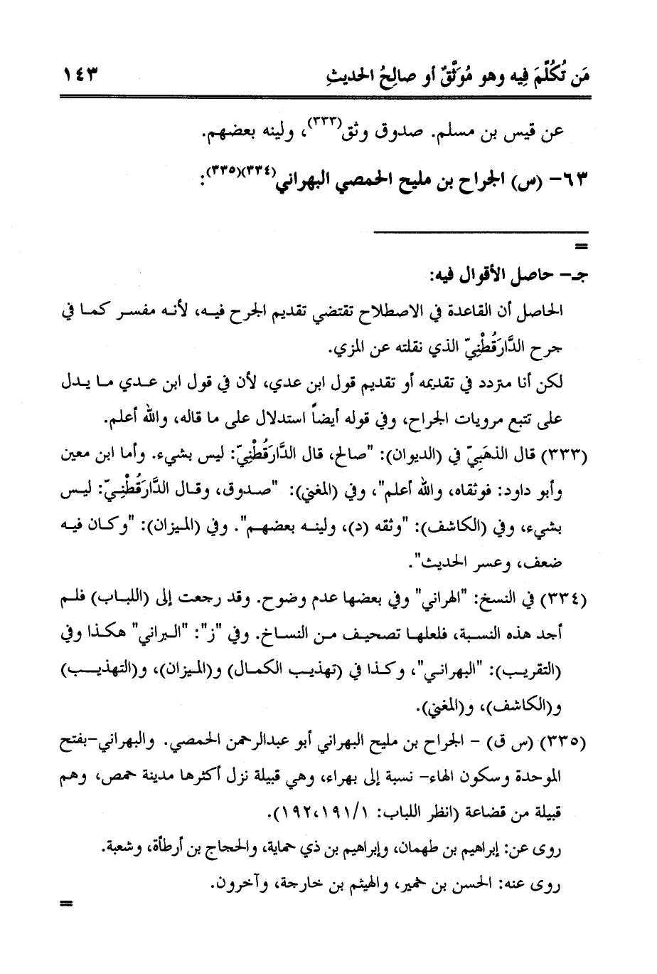 3 س ق - الجراح بن مليح البهراني أبو عبد الرحمن الحمصي. والبهراني-بفتح الموحدة وسكون الهاء- نسبة إلى بهراء، وهي قبيلة نزل أكثرها مدينة حمص، وهم قبيلة من قضاعة انظر اللباب: 1/191،192.