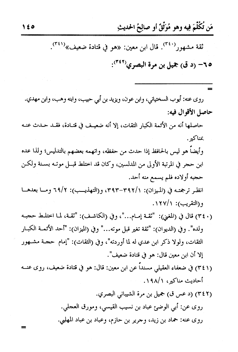 2 في ضعفاء العقيلي مسنداً عن ابن معين: قال: هو في قتادة ضعيف، روى عنه أحاديث مناكير، 1/198.