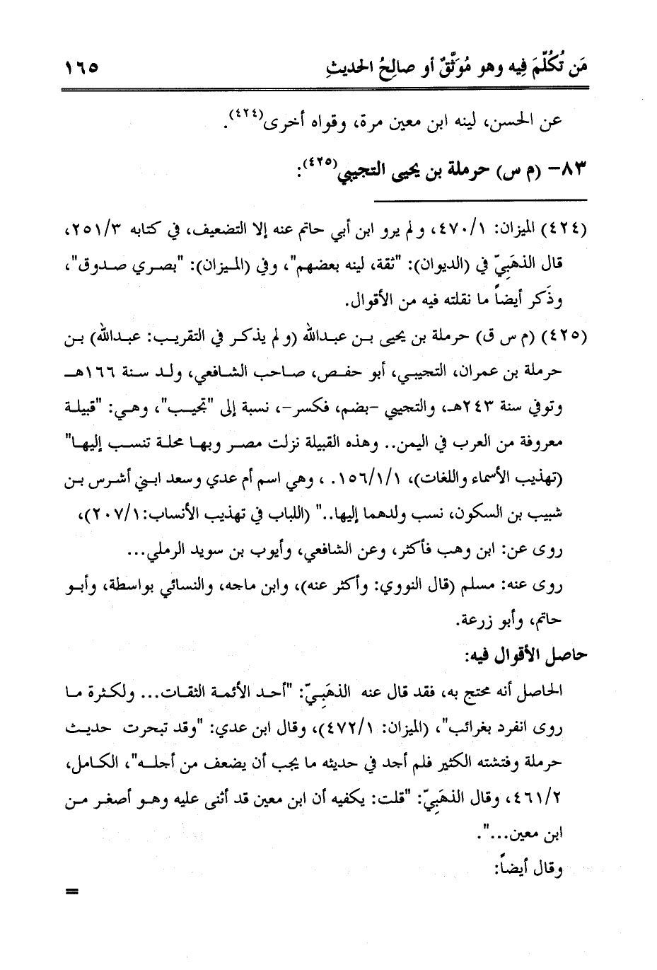 وقال أيضاً: "وقال الحافظ المحقق أبو سعيد ابن يونس -وهو أعلم بالمصريين-: كان حرملة أملأ الناس بما حدث به ابن وهب" الميزان: 1/473 وقد رمز الذهَبِيّ في الميزان للعمل على توثيقه، وقال الإمام النووي: "وكان إماماً حافظاً للحديث والفقه، ويكفيه جلالة إكثار مسلم بن الحجاج عنه في صحيحه" تهذيب الأسماء واللغات: 1/1/156، وقول أبي حاتم: "لا يحتج به" جرح غير مفسر لا يلتفت إليه في مقابل توثيق الأئمة الكثيرين.