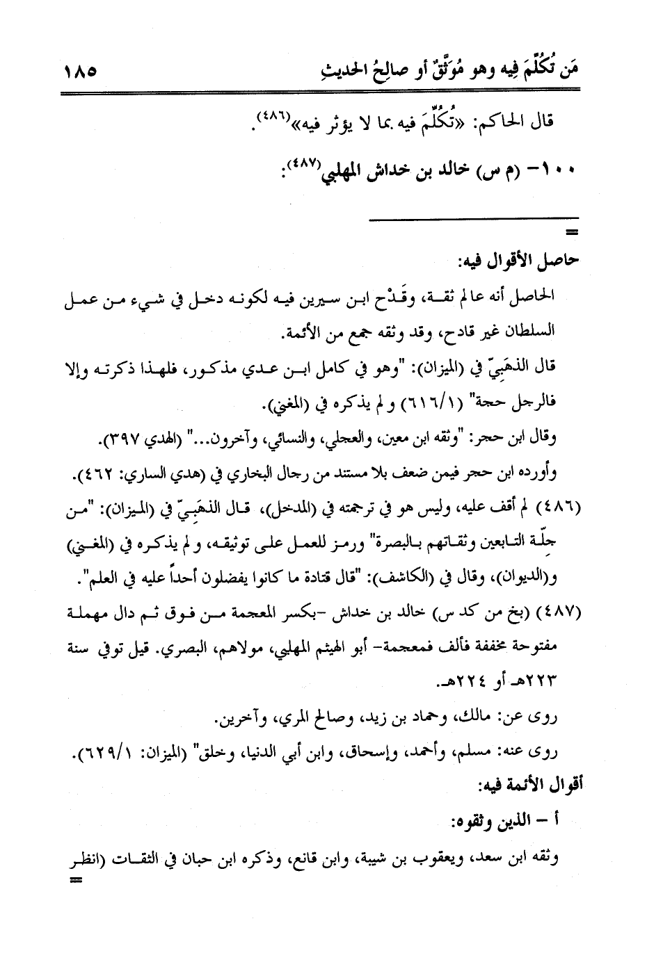 1 لم أقف عليه، وليس هو في ترجمته في المدخل، قال الذهَبِيّ في الميزان: "من جِلّة التابعين وثقاتهم بالبصرة" ورمز للعمل على توثيقه، ولم يذكره في المغني والديوان، وقال في الكاشف: "قال قتادة ما كانوا يفضلون أحداً عليه في العلم".