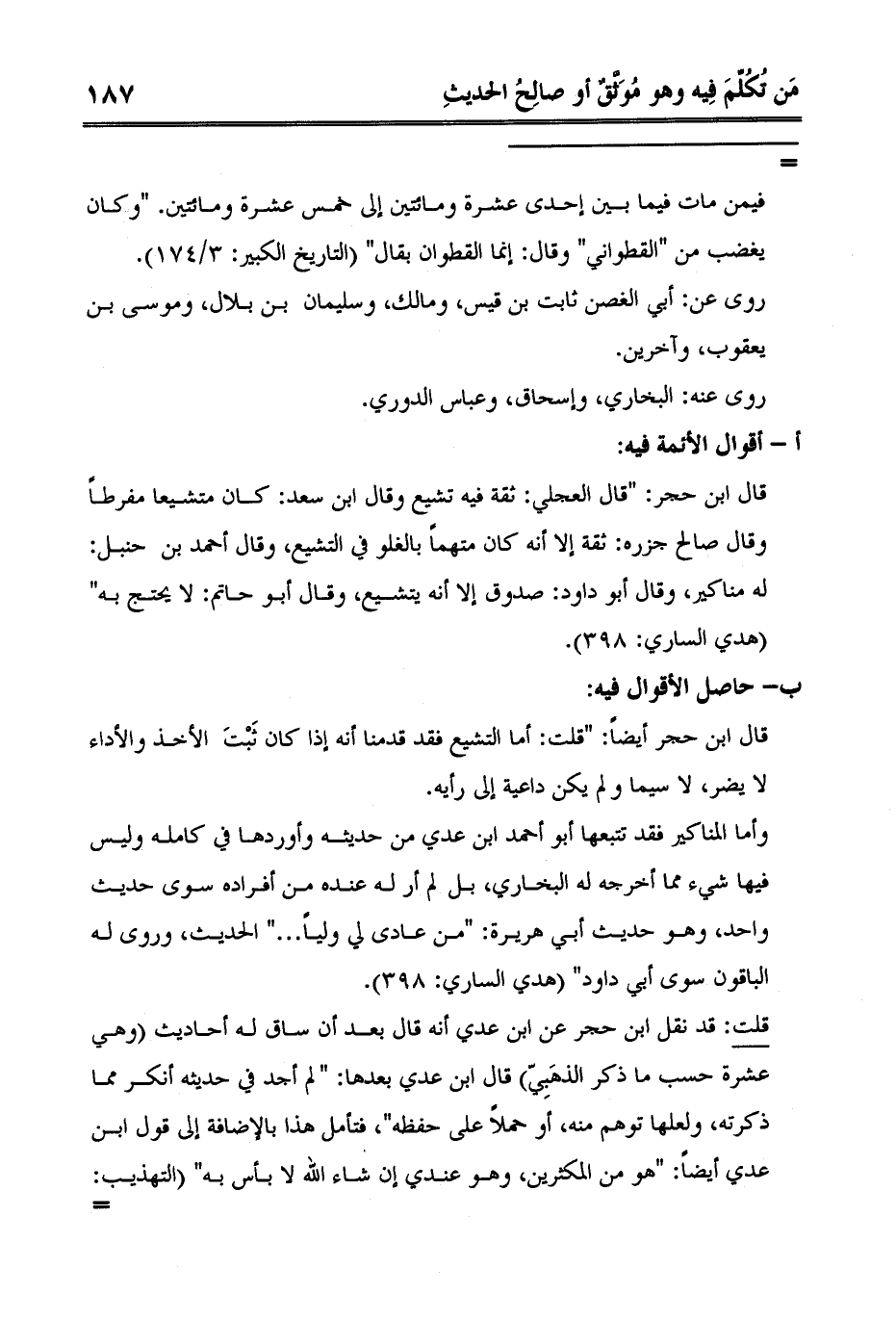 = فيمن مات فيما بين إحدى عشرة ومائتين إلى خمس عشرة ومائتين. "وكان يغضب من "القطواني" وقال: إنما القطوان بقال" التاريخ الكبير: 3/174.