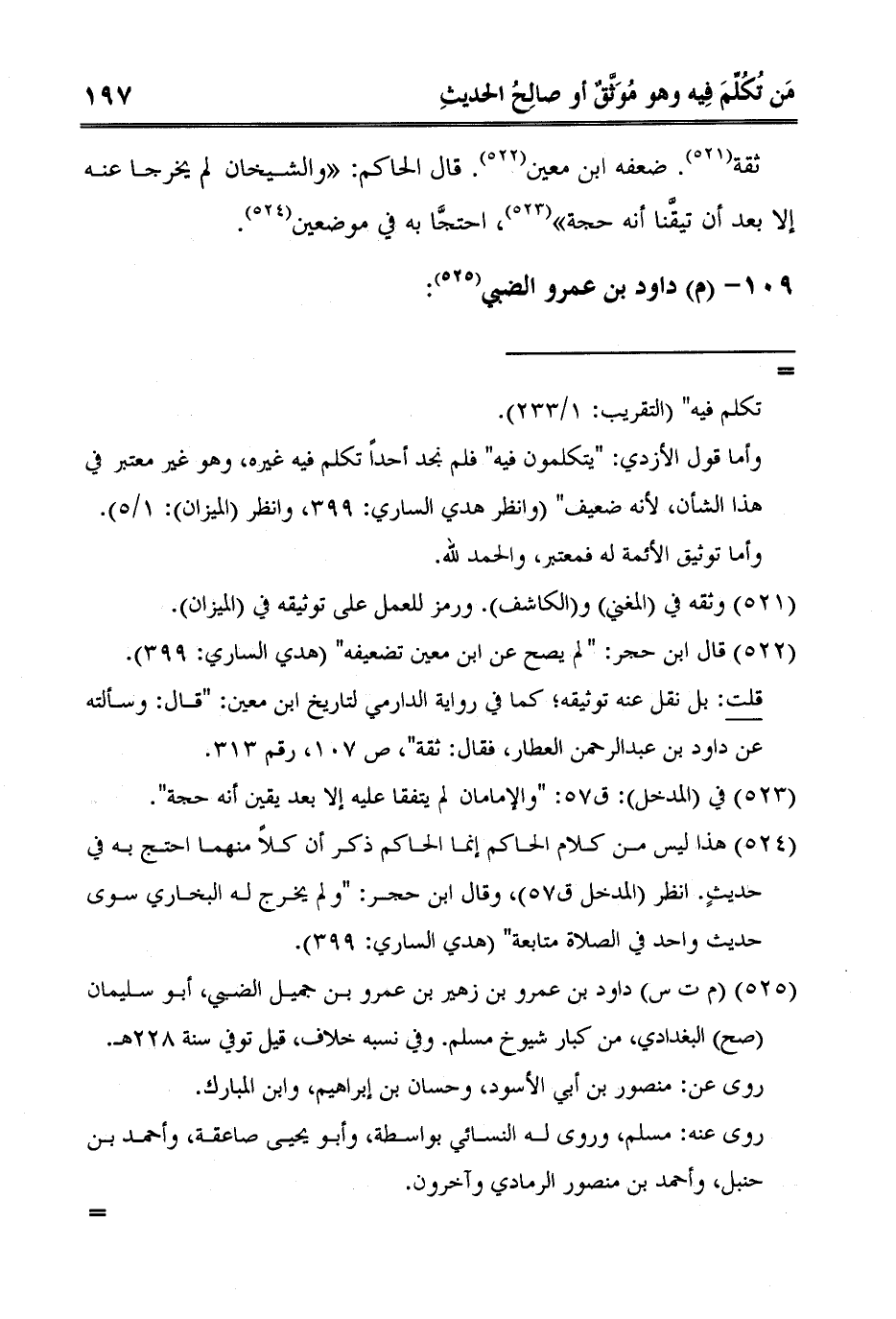 5 م ت س داود بن عمرو بن زهير بن عمرو بن جميل الضبي، أبو سليمان صح البغدادي، من كبار شيوخ مسلم. وفي نسبه خلاف، قيل توفي سنة 228هـ.