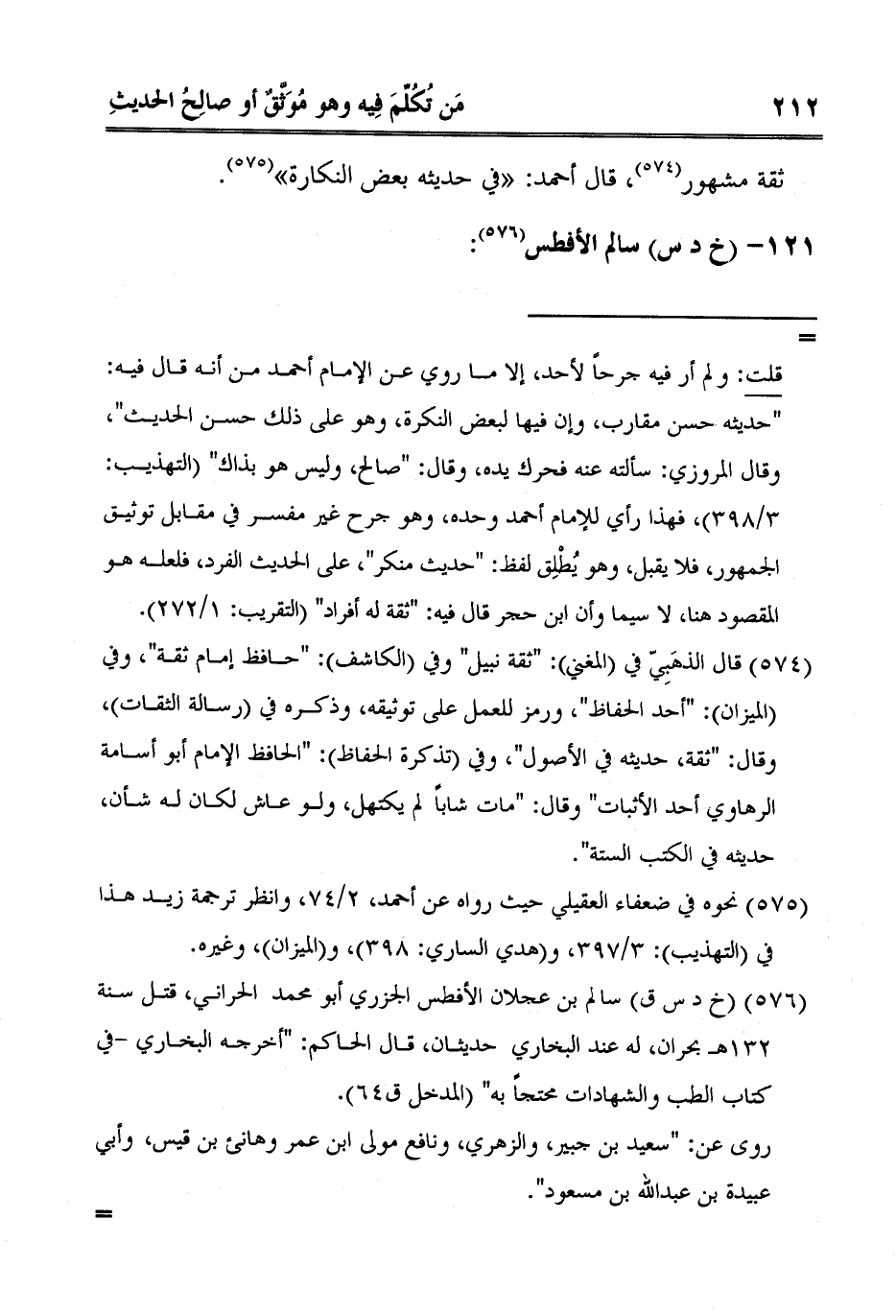 3 خ د س ق سالم بن عجلان الأفطس الجزري أبو محمد الحراني، قتل سنة 132هـ بحران، له عند البخاري حديثان، قال الحاكم: "أخرجه البخاري -في كتاب الطب والشهادات محتجاً به" المدخل ق64.