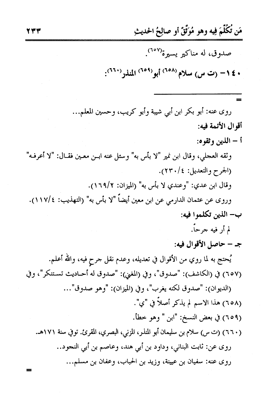 "قال ابن معين: "لا بأس به" وعنه رواية أخرى: "لا شيء" ويحتمل أن يكون أراد سلاماً الطويل" الميزان: 2/177 لكن الذي في الجرح والتعديل: "قال سمعت يحيى بن معين وسئل عن سلام أبي المنذر فقال: "لا شيء" 4/259، وقال ابن جنيد: سألت ابن معين عنه ثقة هو؟ فقال: لا"، التهذيب: 4/284، وقال أبو حاتم: "صدوق صالح الحديث" الجرح والتعديل: 4/259، وقال البخاري: "ويقال عن حماد بن سلمة قال: سلام أحفظ لحديث عاصم من حماد بن زيد" التاريخ الكبير: 4/135.