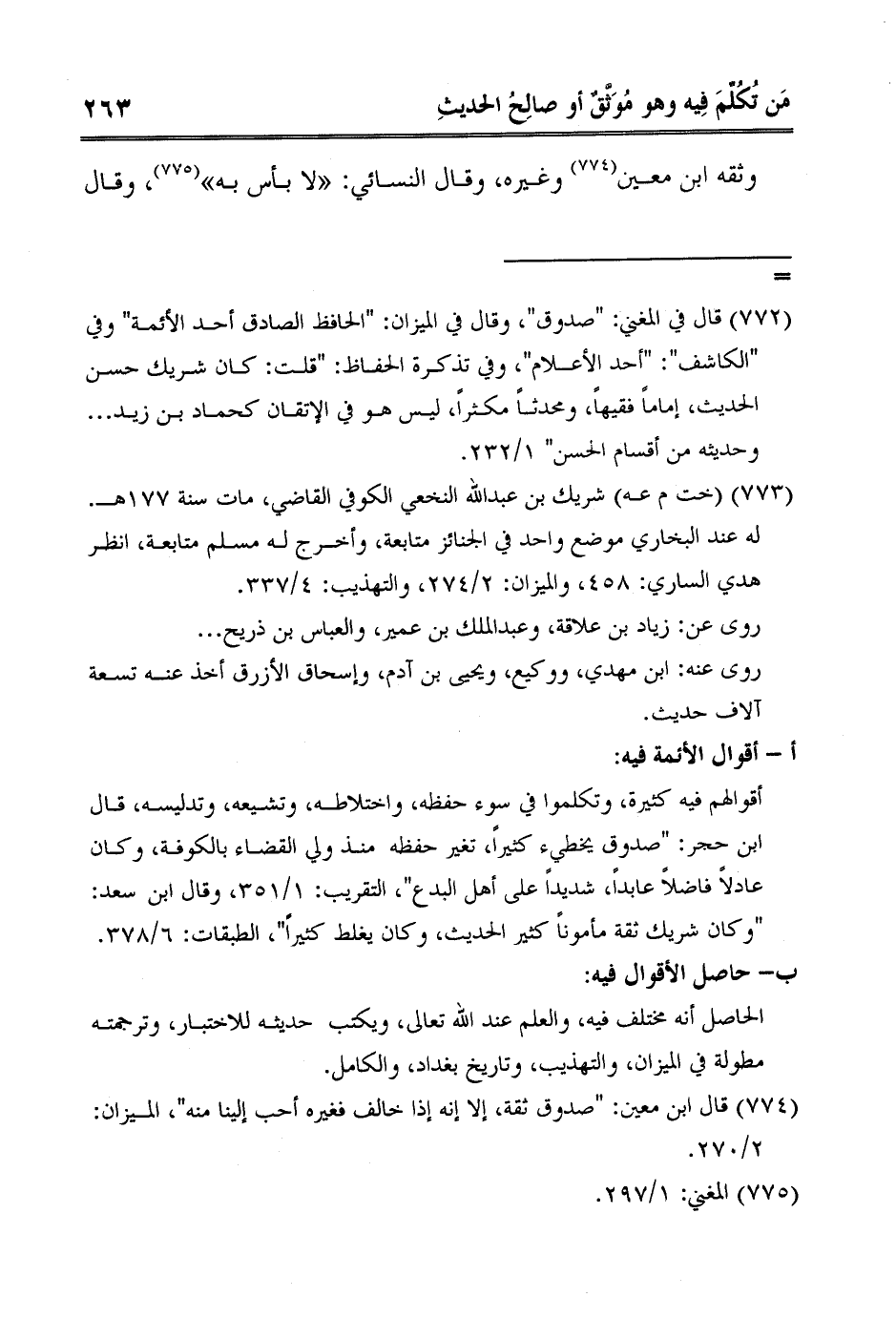 = 7 قال في المغني: "صدوق"، وقال في الميزان: "الحافظ الصادق أحد الأئمة" وفي "الكاشف": "أحد الأعلام"، وفي تذكرة الحفاظ: "قلت: كان شريك حسن الحديث، إماماً فقيهاً، ومحدثاً مكثراً، ليس هو في الإتقان كحماد بن زيد ... وحديثه من أقسام الحسن" 1/232.