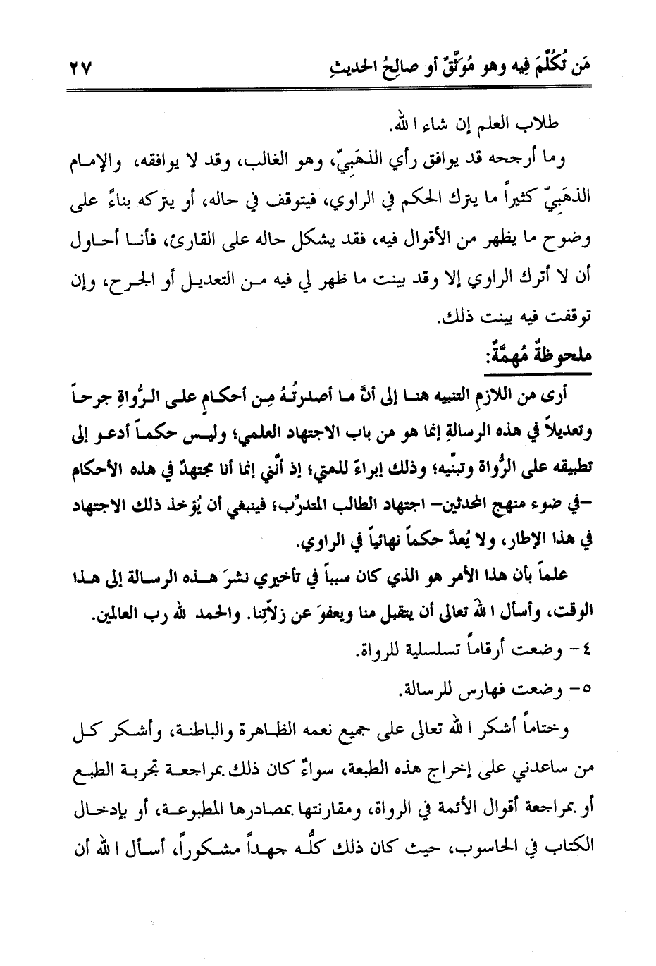أرى من اللازمِ التنبيه هنا إلى أنَّ ما أصدرتُهُ مِن أحكامٍ على الرُّواةِ جرحاً وتعديلاً في هذه الرسالةِ إنما هو من باب الاجتهاد العلمي؛ وليس حكماً أدعو إلى تطبيقه على الرُّواة وتبنِّيه؛ وذلك إبراءً لذمتي؛ إذ أنَّني إنما أنا مجتهدٌ في هذه الأحكام -في ضوء منهج المحدثين- اجتهاد الطالب المتدرِّب؛ فينبغي أن يُؤخذ ذلك الاجتهاد في هذا الإطار، ولا يُعدَّ حكماً نهائياً في الراوي.