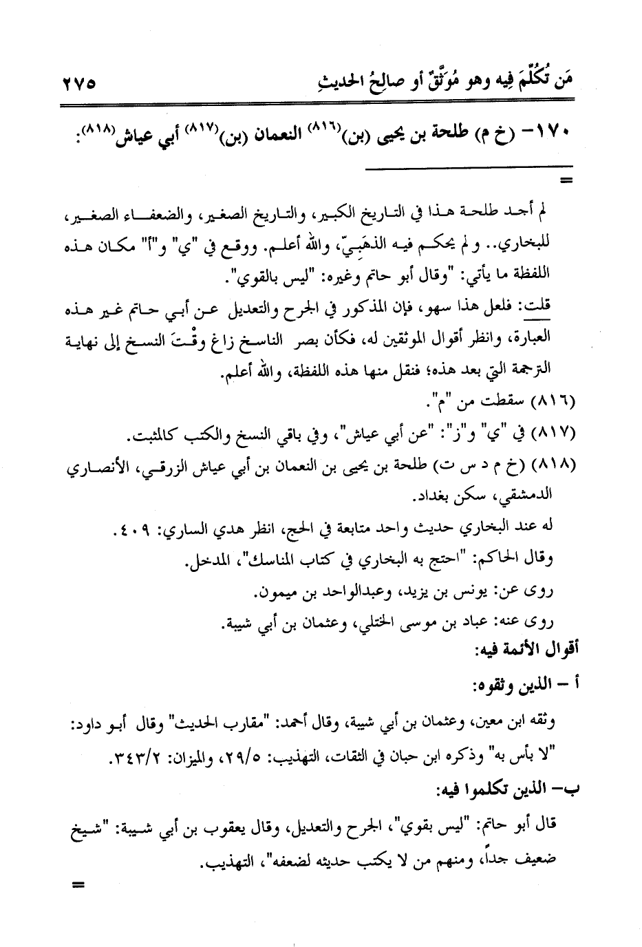 =لم أجد طلحة هذا في التاريخ الكبير، والتاريخ الصغير، والضعفاء الصغير، للبخاري.. ولم يحكم فيه الذهَبِيّ، والله أعلم. ووقع في "ي" و"أ" مكان هذه اللفظة ما يأتي: "وقال أبو حاتم وغيره: "ليس بالقوي".