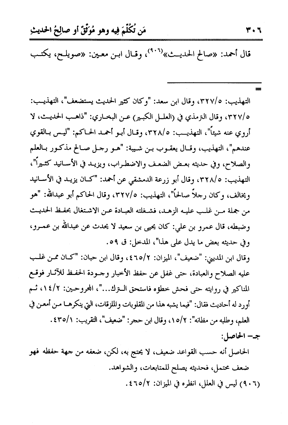 = التهذيب: 5/327، وقال ابن سعد: "وكان كثير الحديث يستضعف"، التهذيب: 5/327، وقال الترمذي في العلل الكبير عن البخاري: "ذاهب الحديث، لا أروي عنه شيئاً"، التهذيب: 5/328، وقال أبو أحمد الحاكم: "ليس بالقوي عندهم"، التهذيب، وقال يعقوب بن شيبة: "هو رجل صالح مذكور بالعلم والصلاح، وفي حديثه بعض الضعف والاضطراب، ويزيد في الأسانيد كثيراً"، التهذيب: 5/328، وقال أبو زرعة الدمشقي عن أحمد: "كان يزيد في الأسانيد ويخالف، وكان رجلاً صالحاً"، التهذيب: 5/327، وقال الحاكم أبو عبد الله: "هو من جملة من غلب عليه الزهد، فشغلته العبادة عن الاشتغال بحفظ الحديث وضبطه، قال عمرو بن علي: كان يحيى بن سعيد لا يحدث عن عبد الله بن عمرو، وفي حديثه بعض ما يدل على هذا"، المدخل: ق 59.