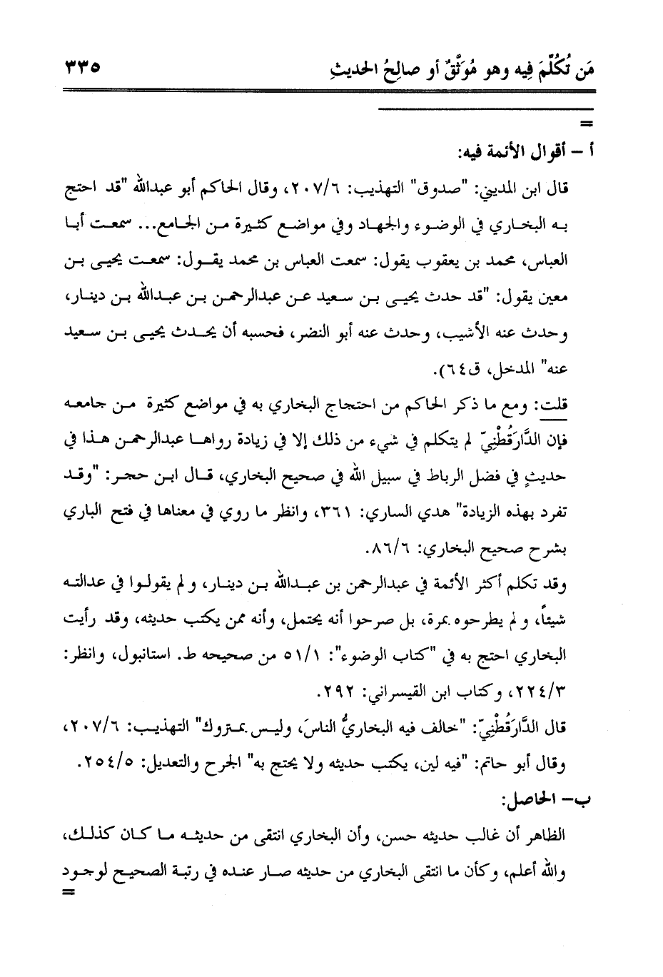 قلت: ومع ما ذكر الحاكم من احتجاج البخاري به في مواضع كثيرة من جامعه فإن الدَّارَقُطْنِيّ لم يتكلم في شيء من ذلك إلا في زيادة رواها عبد الرحمن هذا في حديثٍ في فضل الرباط في سبيل الله في صحيح البخاري، قال ابن حجر: "وقد تفرد بهذه الزيادة" هدي الساري: 361، وانظر ما روي في معناها في فتح الباري بشرح صحيح البخاري: 6/86.