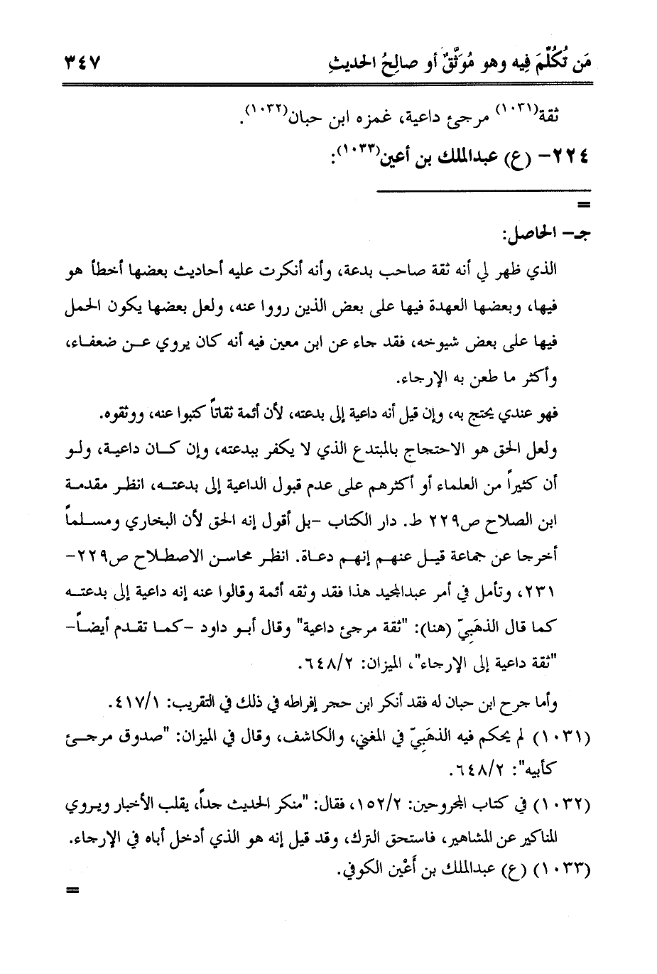 ولعل الحق هو الاحتجاج بالمبتدع الذي لا يكفر ببدعته، وإن كان داعية، ولو أن كثيراً من العلماء أو أكثرهم على عدم قبول الداعية إلى بدعته، انظر مقدمة ابن الصلاح ص229 ط. دار الكتاب -بل أقول إنه الحق لأن البخاري ومسلماً أخرجا عن جماعة قيل عنهم إنهم دعاة. انظر محاسن الاصطلاح ص229-231، وتأمل في أمر عبد المجيد هذا فقد وثقه أئمة وقالوا عنه إنه داعية إلى بدعته كما قال الذهَبِيّ هنا: "ثقة مرجئ داعية" وقال أبو داود -كما تقدم أيضاً- "ثقة داعية إلى الإرجاء"، الميزان: 2/648.
