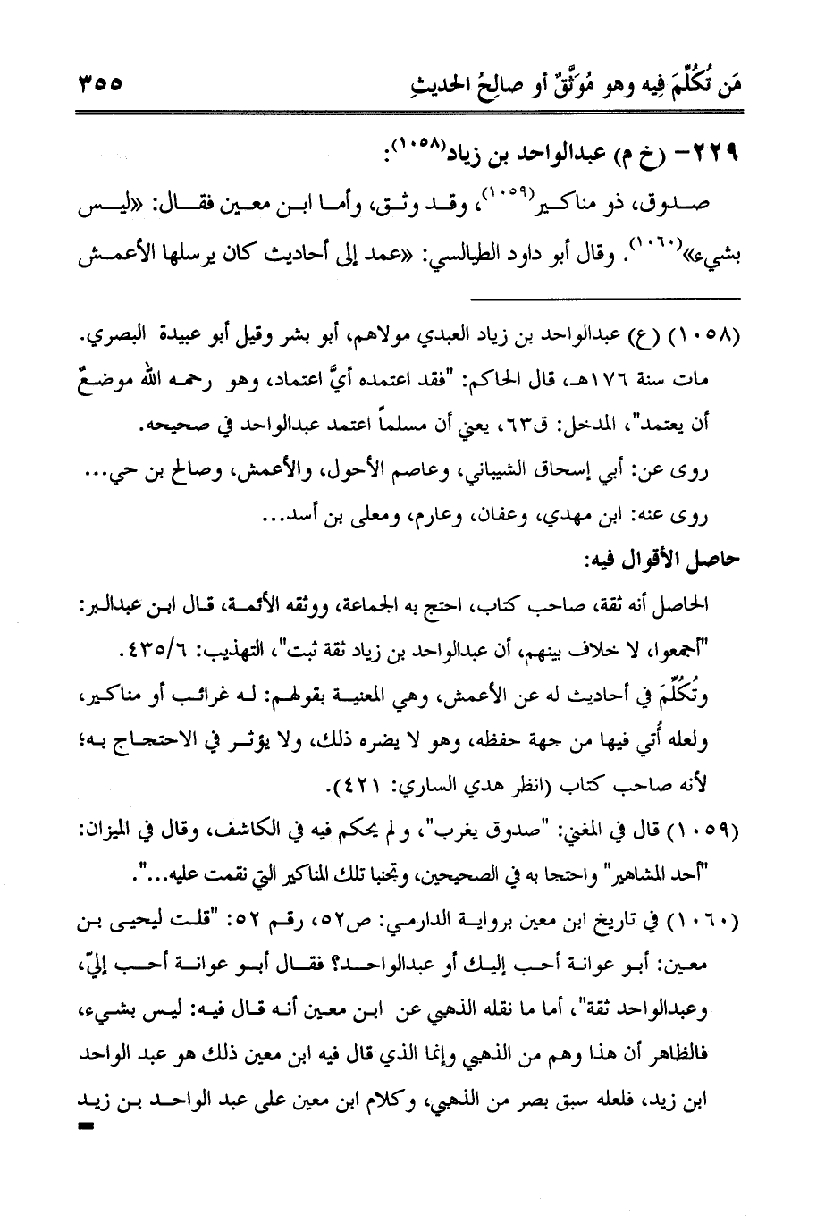 3 في تاريخ ابن معين برواية الدارمي: ص52، رقم 52: "قلت ليحيى بن معين: أبو عوانة أحب إليك أو عبد الواحد؟ فقال أبو عوانة أحب إليّ، وعبد الواحد ثقة"، أما ما نقله الذهبي عن ابن معين أنه قال فيه: ليس بشيء، فالظاهر أن هذا وهم من الذهبي وإنما الذي قال فيه ابن معين ذلك هو عبد الواحد