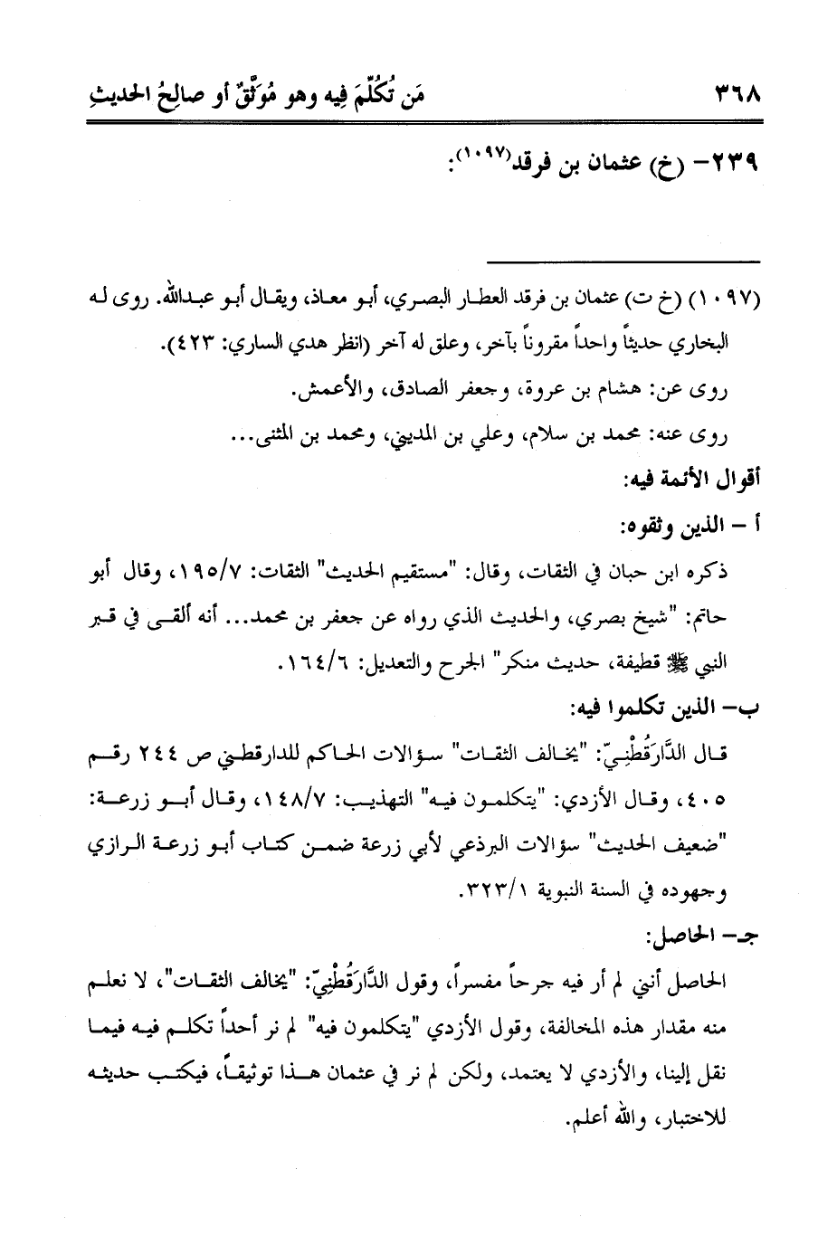 الحاصل أنني لم أر فيه جرحاً مفسراً، وقول الدَّارَقُطْنِيّ: "يخالف الثقات"، لا نعلم منه مقدار هذه المخالفة، وقول الأزدي "يتكلمون فيه" لم نر أحداً تكلم فيه فيما نقل إلينا، والأزدي لا يعتمد، ولكن لم نر في عثمان هذا توثيقاً، فيكتب حديثه للاختبار، والله أعلم.