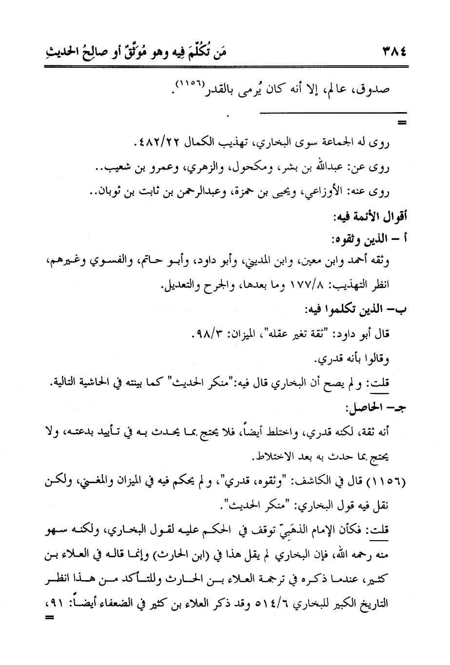 1 قال في الكاشف: "وثقوه، قدري"، ولم يحكم فيه في الميزان والمغني، ولكن نقل فيه قول البخاري: "منكر الحديث".