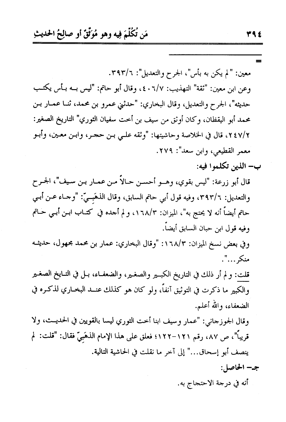 وقال الجوزجاني: "عمار وسيف ابنا أخت الثوري ليسا بالقويين في الحديث، ولا قريباً"، ص 87، رقم 121-122؛ فعلق على هذا الإمام الذهَبِيّ فقال: "قلت: لم ينصف أبو إسحاق ... " إلى آخر ما نقلت في الحاشية التالية.