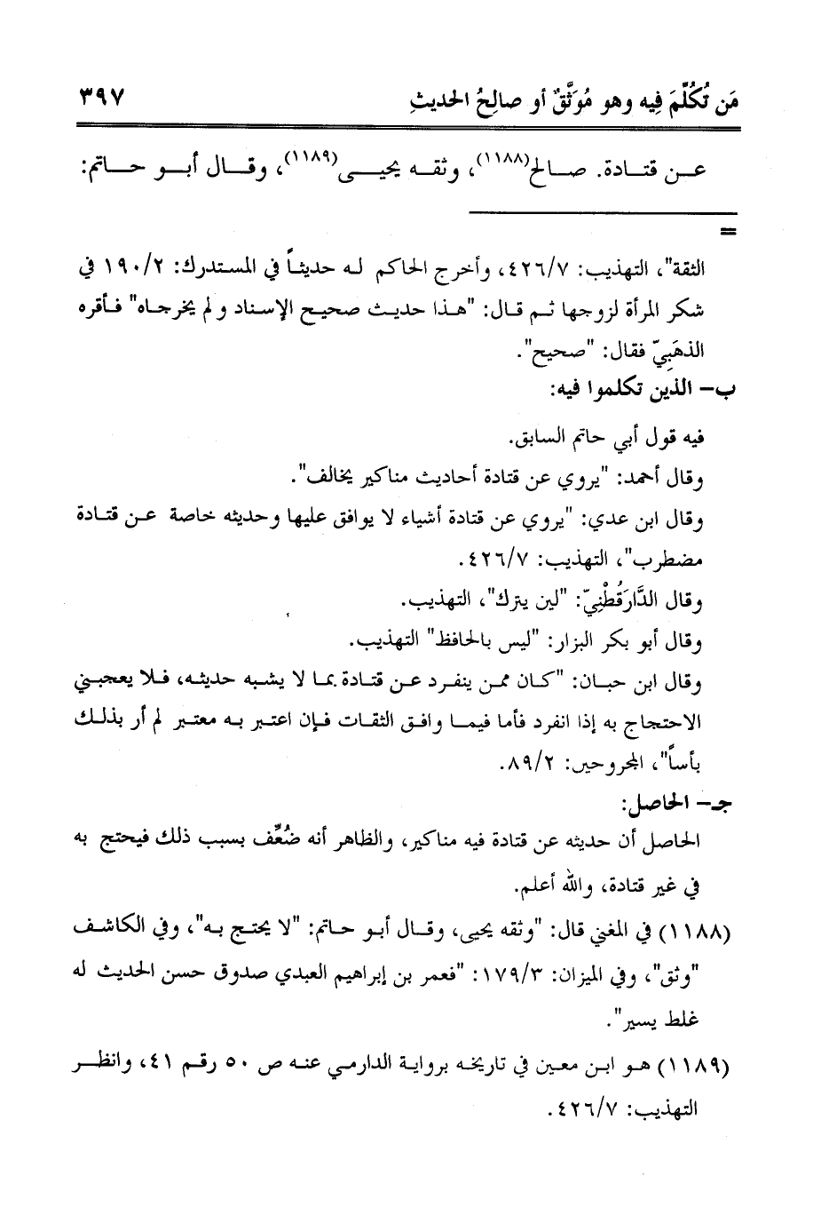وقال ابن عدي: "يروي عن قتادة أشياء لا يوافق عليها وحديثه خاصة عن قتادة مضطرب"، التهذيب: 7/426.
