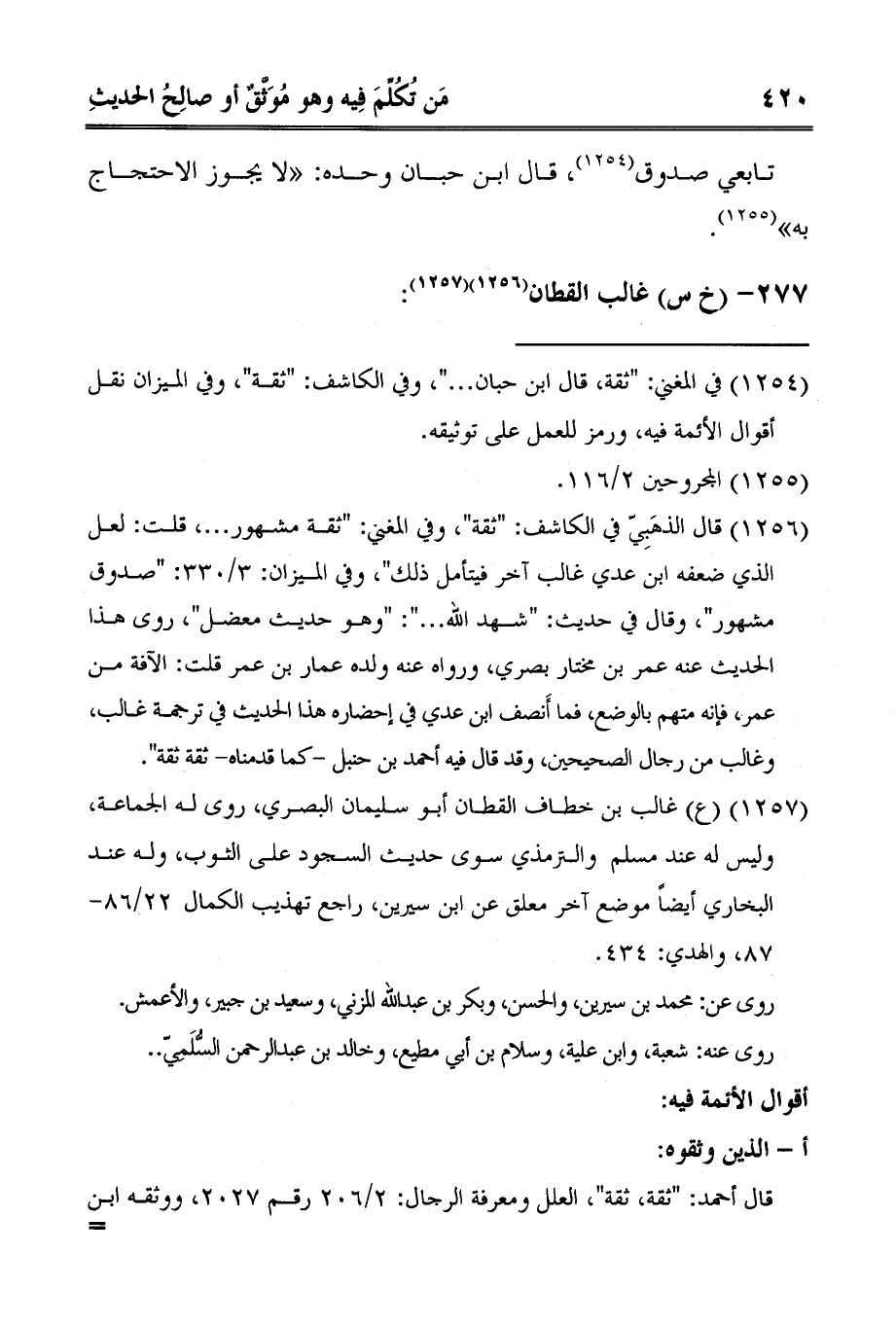 4 ع غالب بن خطاف القطان أبو سليمان البصري، روى له الجماعة، وليس له عند مسلم والترمذي سوى حديث السجود على الثوب، وله عند البخاري أيضاً موضع آخر معلق عن ابن سيرين، راجع تهذيب الكمال 22/86-87، والهدي: 434.