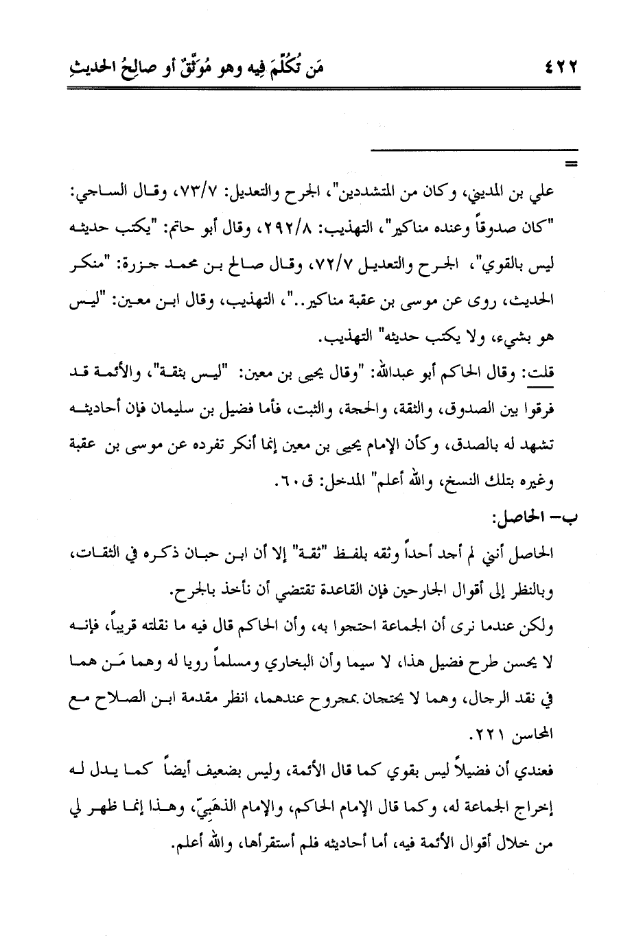 قلت: وقال الحاكم أبو عبد الله: "وقال يحيى بن معين: "ليس بثقة"، والأئمة قد فرقوا بين الصدوق، والثقة، والحجة، والثبت، فأما فضيل بن سليمان فإن أحاديثه تشهد له بالصدق، وكأن الإمام يحيى بن معين إنما أنكر تفرده عن موسى بن عقبة وغيره بتلك النسخ، والله أعلم" المدخل: ق60.