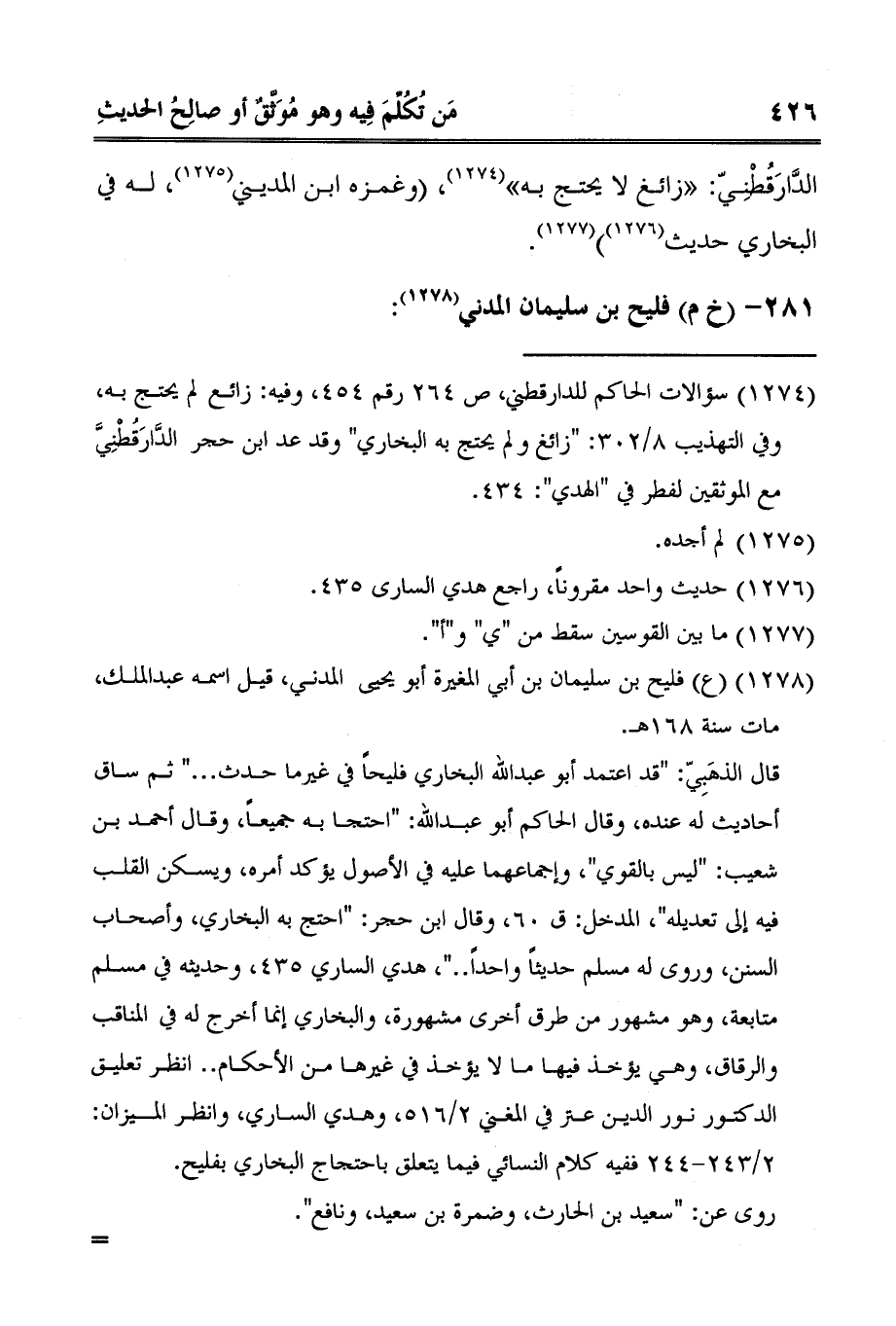 قال الذهَبِيّ: "قد اعتمد أبو عبد الله البخاري فليحاً في غيرما حدث ... " ثم ساق أحاديث له عنده، وقال الحاكم أبو عبد الله: "احتجا به جميعاً، وقال أحمد بن شعيب: "ليس بالقوي"، وإجماعهما عليه في الأصول يؤكد أمره، ويسكن القلب فيه إلى تعديله"، المدخل: ق 60، وقال ابن حجر: "احتج به البخاري، وأصحاب السنن، وروى له مسلم حديثاً واحداً.."، هدي الساري 435، وحديثه في مسلم متابعة، وهو مشهور من طرق أخرى مشهورة، والبخاري إنما أخرج له في المناقب والرقاق، وهي يؤخذ فيها ما لا يؤخذ في غيرها من الأحكام.. انظر تعليق الدكتور نور الدين عتر في المغني 2/516، وهدي الساري، وانظر الميزان: 2/243-244 ففيه كلام النسائي فيما يتعلق باحتجاج البخاري بفليح.