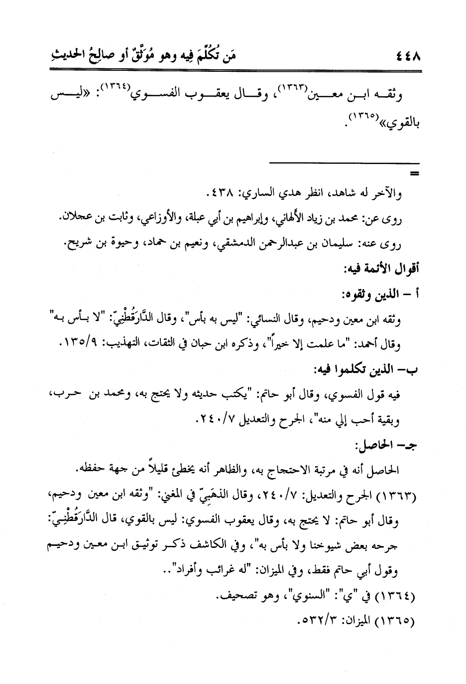 1 الجرح والتعديل: 7/240، وقال الذهَبِيّ في المغني: "وثقه ابن معين ودحيم، وقال أبو حاتم: لا يحتج به، وقال يعقوب الفسوي: ليس بالقوي، قال الدَّارَقُطْنِيّ: جرحه بعض شيوخنا ولا بأس به"، وفي الكاشف ذكر توثيق ابن معين ودحيم وقول أبي حاتم فقط، وفي الميزان: "له غرائب وأفراد"..
