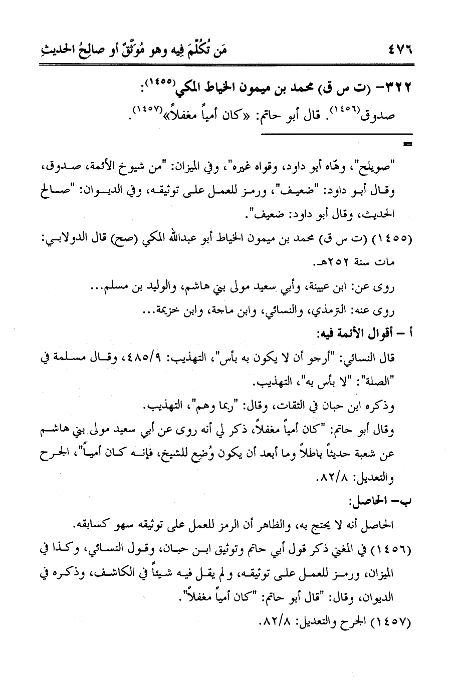 2 في المغني ذكر قول أبي حاتم وتوثيق ابن حبان، وقول النسائي، وكذا في الميزان، ورمز للعمل على توثيقه، ولم يقل فيه شيئاً في الكاشف، وذكره في الديوان، وقال: "قال أبو حاتم: "كان أمياً مغفلاً".