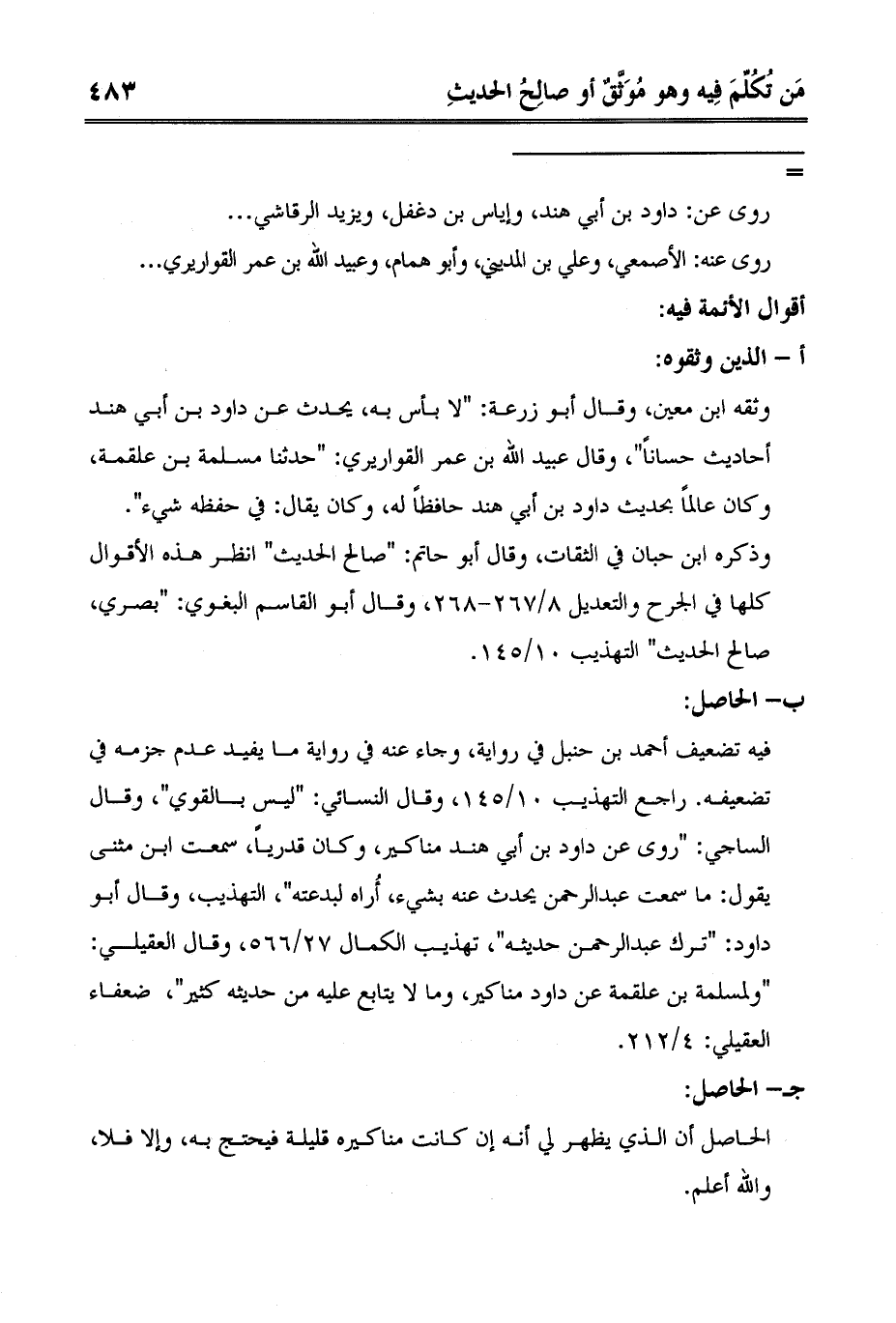فيه تضعيف أحمد بن حنبل في رواية، وجاء عنه في رواية ما يفيد عدم جزمه في تضعيفه. راجع التهذيب 10/145، وقال النسائي: "ليس بالقوي"، وقال الساجي: "روى عن داود بن أبي هند مناكير، وكان قدرياً، سمعت ابن مثنى يقول: ما سمعت عبد الرحمن يحدث عنه بشيء، أُراه لبدعته"، التهذيب، وقال أبو داود: "ترك عبد الرحمن حديثه"، تهذيب الكمال 27/566، وقال العقيلي: "ولمسلمة بن علقمة عن داود مناكير، وما لا يتابع عليه من حديثه كثير"، ضعفاء العقيلي: 4/212.
