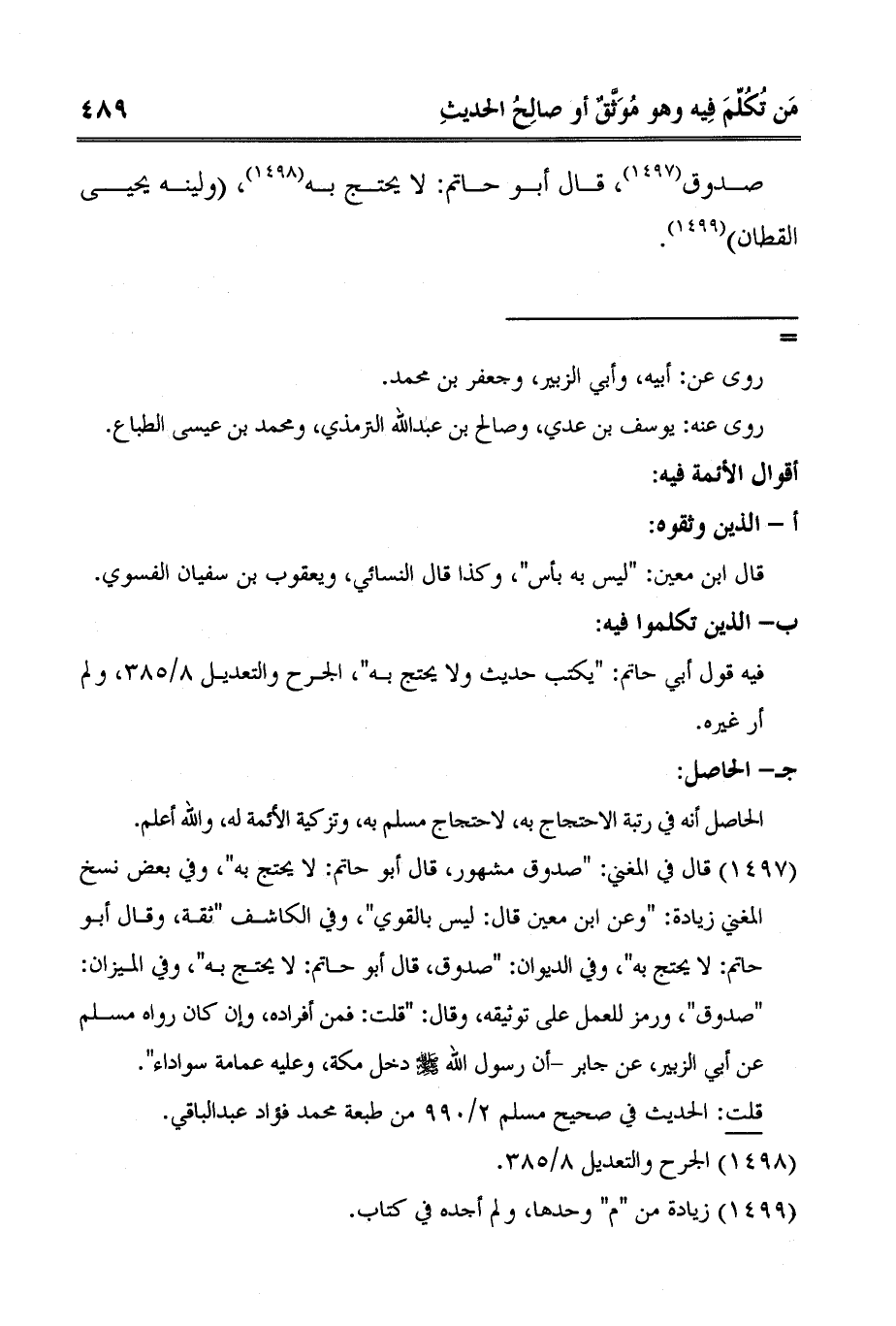 1 قال في المغني: "صدوق مشهور، قال أبو حاتم: لا يحتج به"، وفي بعض نسخ المغني زيادة: "وعن ابن معين قال: ليس بالقوي"، وفي الكاشف "ثقة، وقال أبو حاتم: لا يحتج به"، وفي الديوان: "صدوق، قال أبو حاتم: لا يحتج به"، وفي الميزان: "صدوق"، ورمز للعمل على توثيقه، وقال: "قلت: فمن أفراده، وإن كان رواه مسلم عن أبي الزبير، عن جابر -أن رسول الله صلى الله عليه وسلم دخل مكة، وعليه عمامة سواداء".