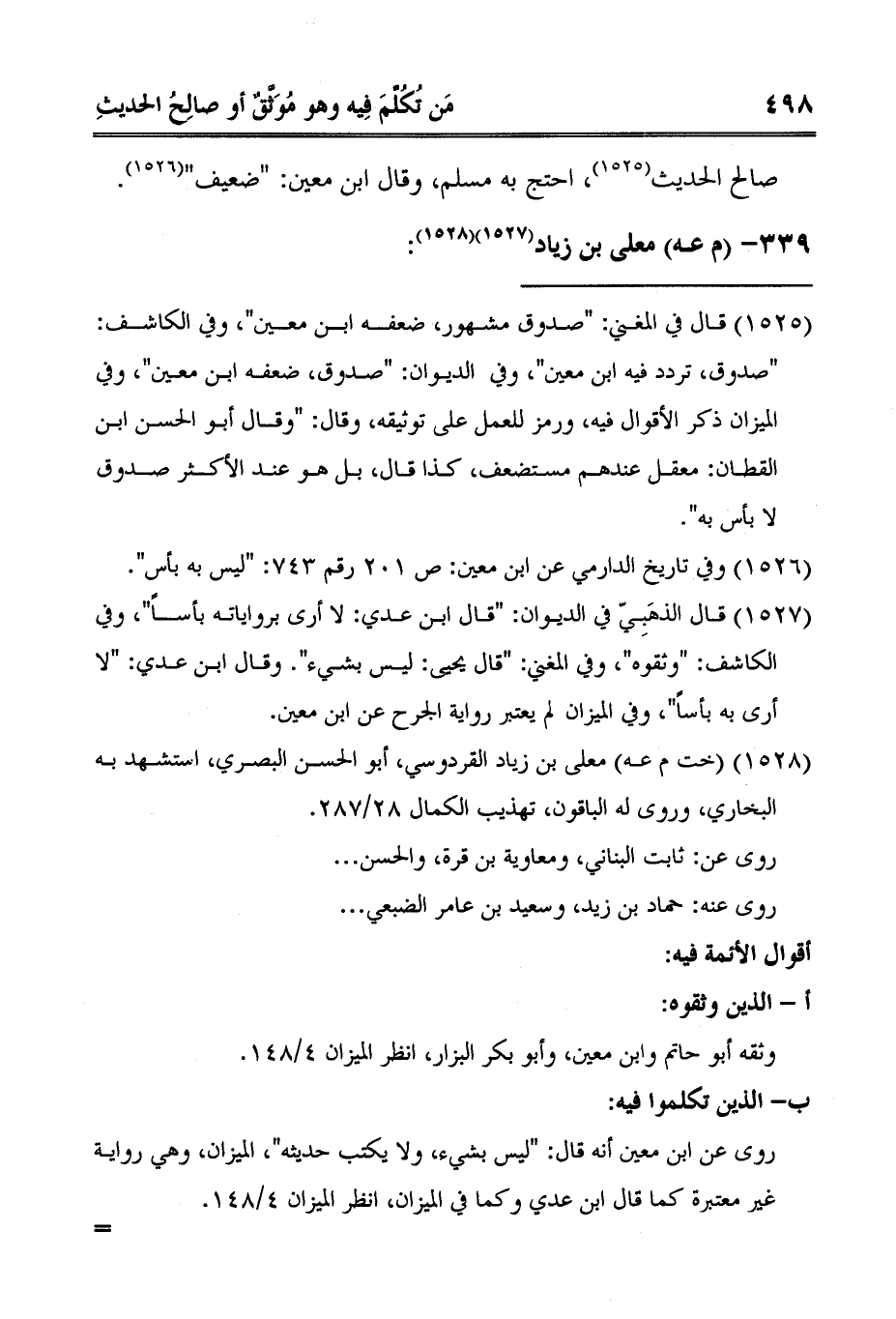 3 قال الذهَبِيّ في الديوان: "قال ابن عدي: لا أرى برواياته بأساً"، وفي الكاشف: "وثقوه"، وفي المغني: "قال يحيى: ليس بشيء". وقال ابن عدي: "لا أرى به بأساً"، وفي الميزان لم يعتبر رواية الجرح عن ابن معين.