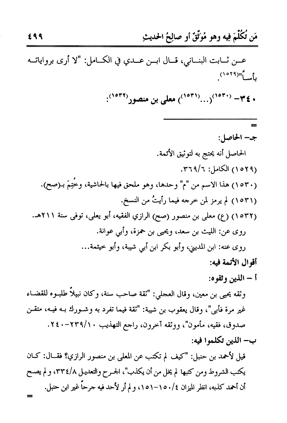 قيل لأحمد بن حنبل: "كيف لم تكتب عن المعلى بن منصور الرازي؟ فقال: كان يكتب الشروط ومن كتبها لم يخل من أن يكذب"، الجرح والتعديل 8/334، ولم يصح أن أحمد كذبه، انظر الميزان 4/150-151، ولم أر لأحد فيه جرحاً غير ابن حنبل.=