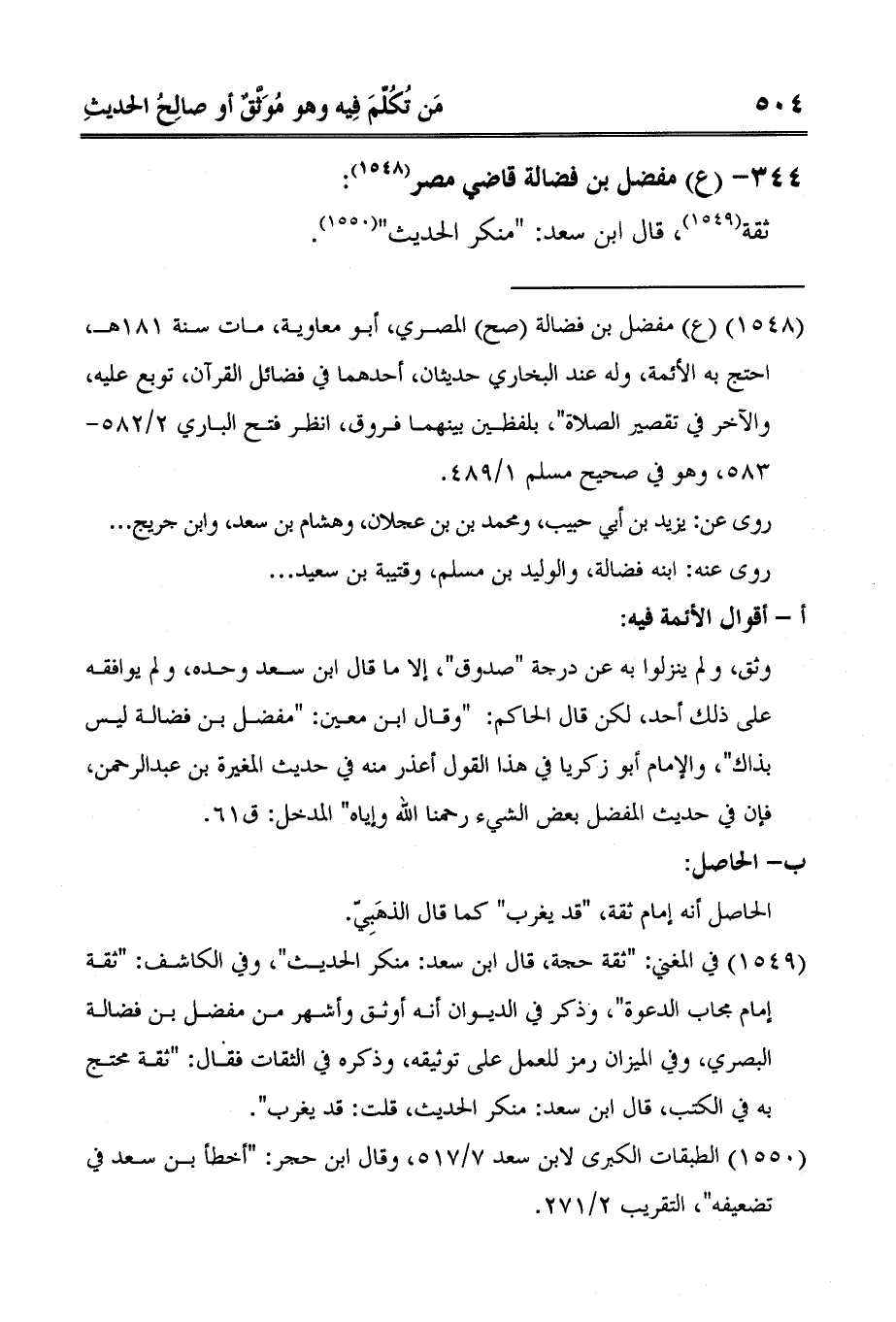 2 في المغني: "ثقة حجة، قال ابن سعد: منكر الحديث"، وفي الكاشف: "ثقة إمام مجاب الدعوة"، وذكر في الديوان أنه أوثق وأشهر من مفضل بن فضالة البصري، وفي الميزان رمز للعمل على توثيقه، وذكره في الثقات فقال: "ثقة محتج به في الكتب، قال ابن سعد: منكر الحديث، قلت: قد يغرب".