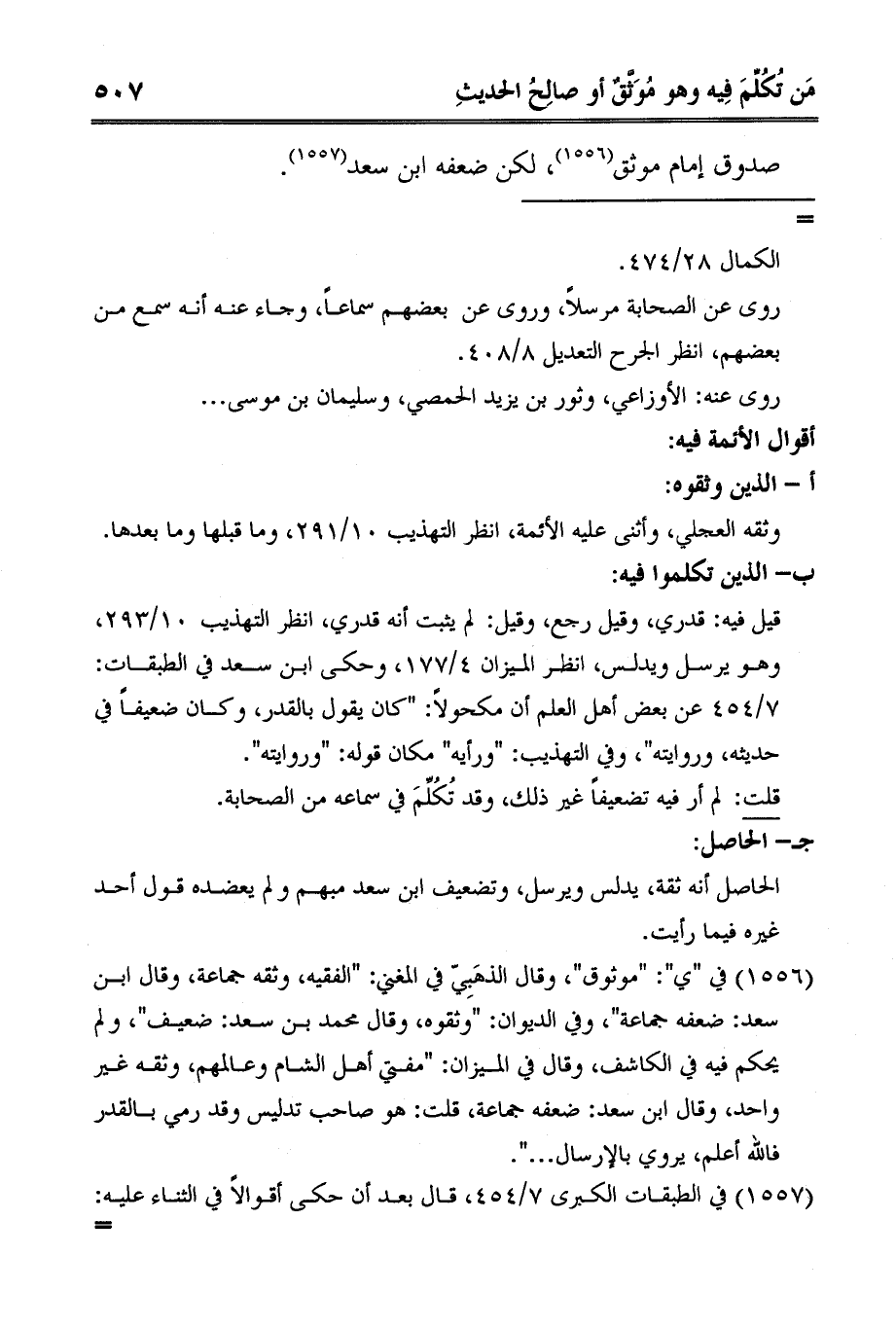 1 في "ي": "موثوق"، وقال الذهَبِيّ في المغني: "الفقيه، وثقه جماعة، وقال ابن سعد: ضعفه جماعة"، وفي الديوان: "وثقوه، وقال محمد بن سعد: ضعيف"، ولم يحكم فيه في الكاشف، وقال في الميزان: "مفتي أهل الشام وعالمهم، وثقه غير واحد، وقال ابن سعد: ضعفه جماعة، قلت: هو صاحب تدليس وقد رمي بالقدر فالله أعلم، يروي بالإرسال ... ".