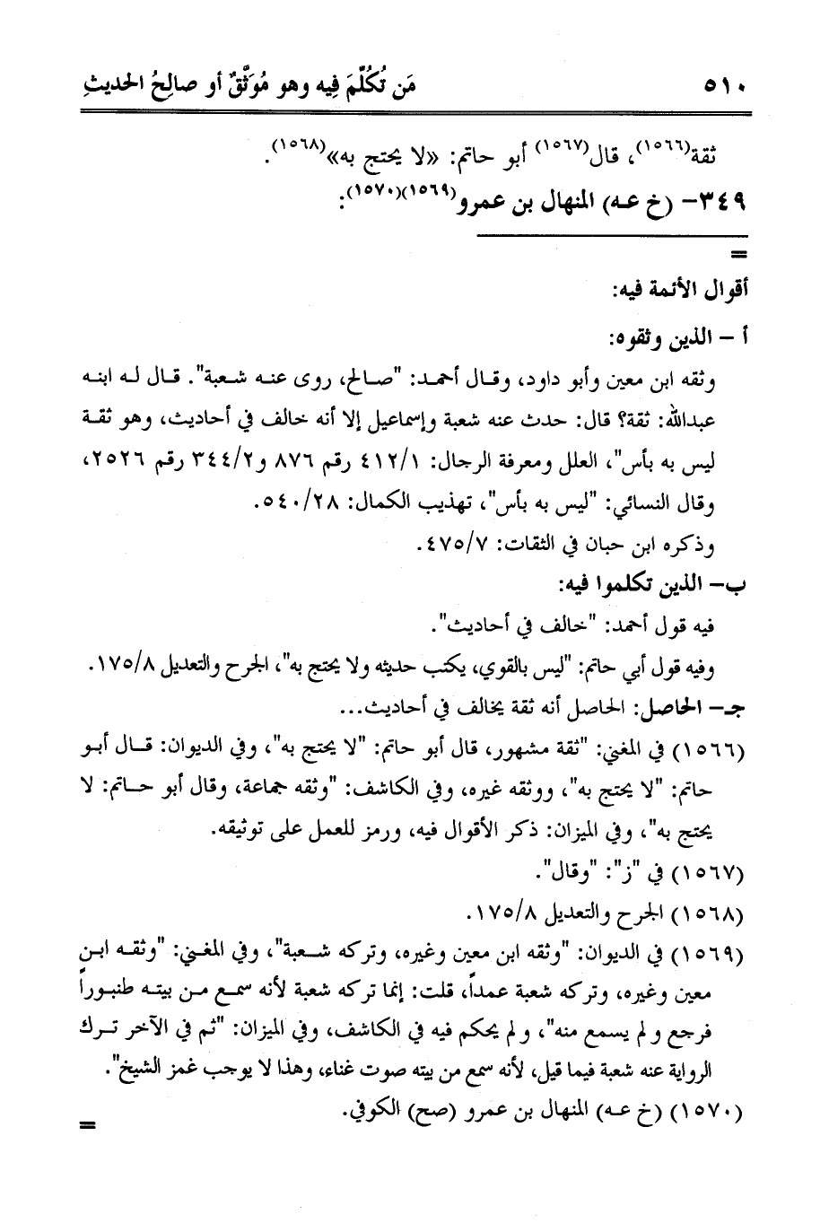 1 في المغني: "ثقة مشهور، قال أبو حاتم: "لا يحتج به"، وفي الديوان: قال أبو حاتم: "لا يحتج به"، ووثقه غيره، وفي الكاشف: "وثقه جماعة، وقال أبو حاتم: لا يحتج به"، وفي الميزان: ذكر الأقوال فيه، ورمز للعمل على توثيقه.