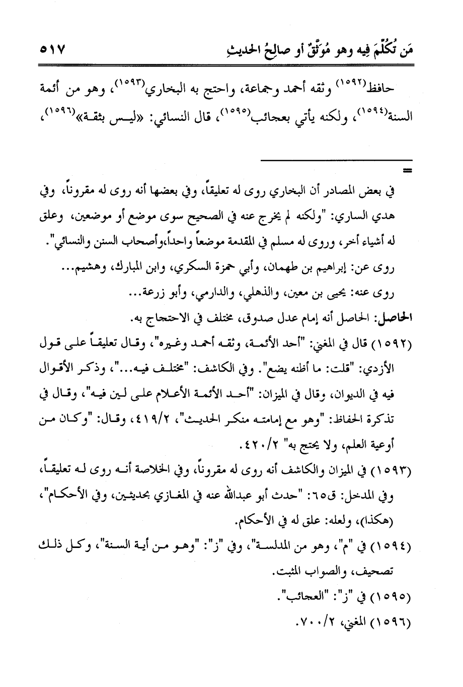 1 قال في المغني: "أحد الأئمة، وثقه أحمد وغيره"، وقال تعليقاً على قول الأزدي: "قلت: ما أظنه يضع". وفي الكاشف: "مختلف فيه ... "، وذكر الأقوال فيه في الديوان، وقال في الميزان: "أحد الأئمة الأعلام على لين فيه"، وقال في تذكرة الحفاظ: "وهو مع إمامته منكر الحديث"، 2/419، وقال: "وكان من أوعية العلم، ولا يحتج به" 2/420.