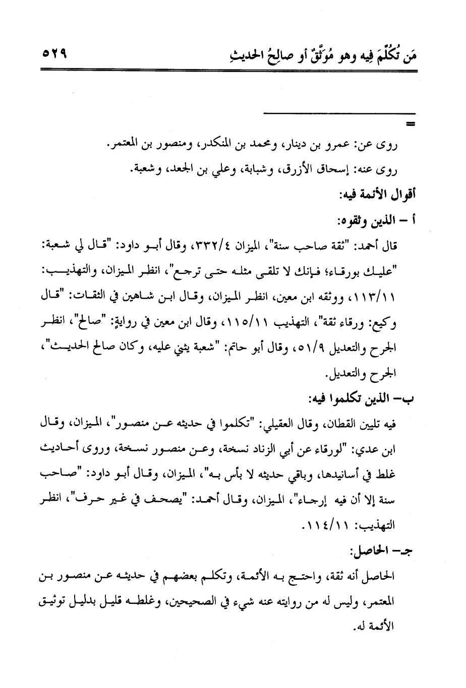 فيه تليين القطان، وقال العقيلي: "تكلموا في حديثه عن منصور"، الميزان، وقال ابن عدي: "لورقاء عن أبي الزناد نسخة، وعن منصور نسخة، وروى أحاديث غلط في أسانيدها، وباقي حديثه لا بأس به"، الميزان، وقال أبو داود: "صاحب سنة إلا أن فيه إرجاء"، الميزان، وقال أحمد: "يصحف في غير حرف"، انظر التهذيب: 11/114.