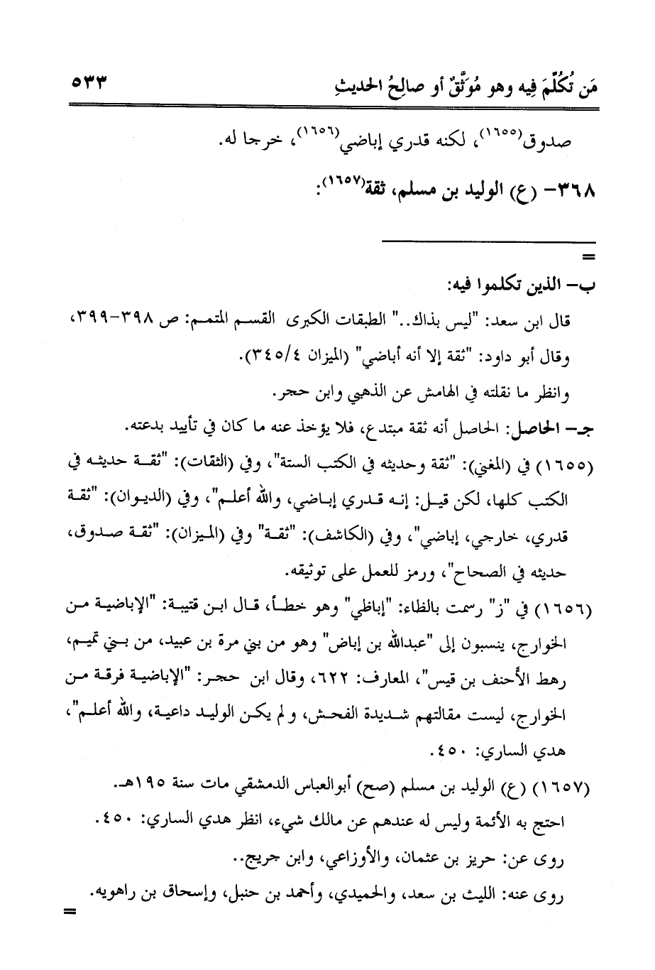 1 في المغني: "ثقة وحديثه في الكتب الستة"، وفي الثقات: "ثقة حديثه في الكتب كلها، لكن قيل: إنه قدري إباضي، والله أعلم"، وفي الديوان: "ثقة قدري، خارجي، إباضي"، وفي الكاشف: "ثقة" وفي الميزان: "ثقة صدوق، حديثه في الصحاح"، ورمز للعمل على توثيقه.