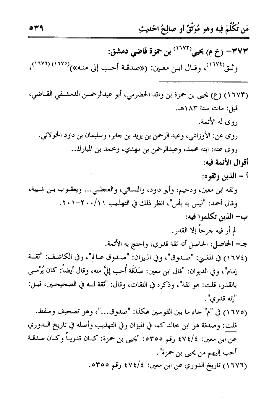 قلت: وصدقة هو ابن خالد كما في الميزان وفي التهذيب وأصله في تاريخ الدوري عن ابن معين: 4/474 رقم 5355: "يحيى بن حمزة: كان قدرياً وكان صدقة أحب إليهم من يحيى بن حمزة".