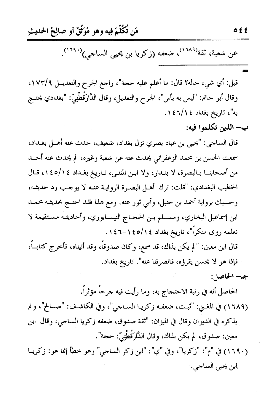 1 في المغني: "ثبت، ضعفه زكريا الساجي"، وفي الكاشف: "صالح"، ولم يذكره في الديوان وقال في الميزان: "ثقة صدوق، ضعفه زكريا الساجي، وقال ابن معين: صدوق، لم يكن بذاك، وقال الدَّارَقُطْنِيّ: حجة".