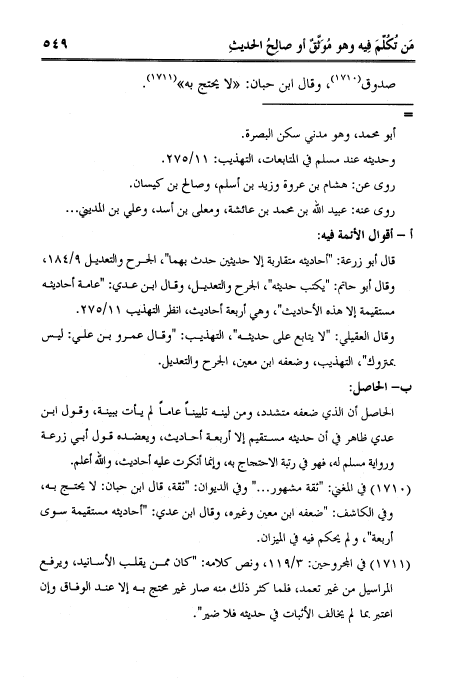 1 في المغني: "ثقة مشهور ... " وفي الديوان: "ثقة، قال ابن حبان: لا يحتج به، وفي الكاشف: "ضعفه ابن معين وغيره، وقال ابن عدي: "أحاديثه مستقيمة سوى أربعة"، ولم يحكم فيه في الميزان.