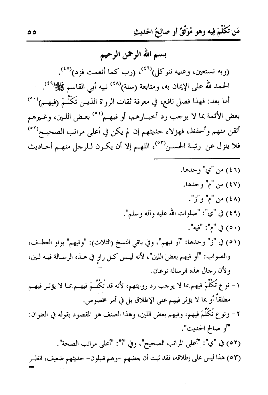 أما بعد: فهذا فصل نافع، في معرفة ثقات الرواة الذين تَكَلَّمَ "فيهم""5" بعض الأئمة بما لا يوجب رد أخبارهم، أو فيهم"6" بعض اللين، وغيرهم أتقن منهم وأحفظ، فهؤلاء حديثهم إن لم يكن في أعلى مراتب الصحيح"7" فلا ينزل عن رتبة الحسن"8"، اللهم إلا أن يكون للرجل منهم أحاديث