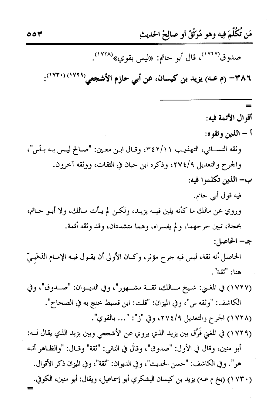 3 في المغني فَرَّق بين يزيد الذي يروي عن الأشجعي وبين يزيد الذي يقال له: أبو منين، وقال في الأول: "صدوق"، وقال في الثاني: "ثقة" وقال: "والظاهر أنه هو". وفي الكاشف: "حسن الحديث"، وفي الديوان: "ثقة"، وفي الميزان ذكر الأقوال.