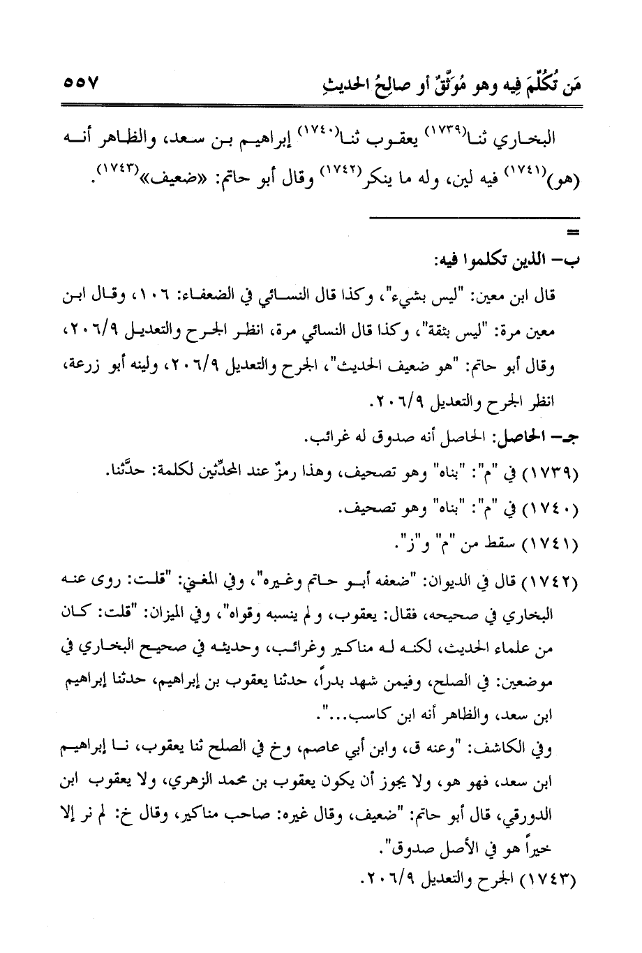 وفي الكاشف: "وعنه ق، وابن أبي عاصم، وخ في الصلح ثنا يعقوب، نا إبراهيم بن سعد، فهو هو، ولا يجوز أن يكون يعقوب بن محمد الزهري، ولا يعقوب ابن الدورقي، قال أبو حاتم: "ضعيف، وقال غيره: صاحب مناكير، وقال خ: لم نر إلا خيراً هو في الأصل صدوق".