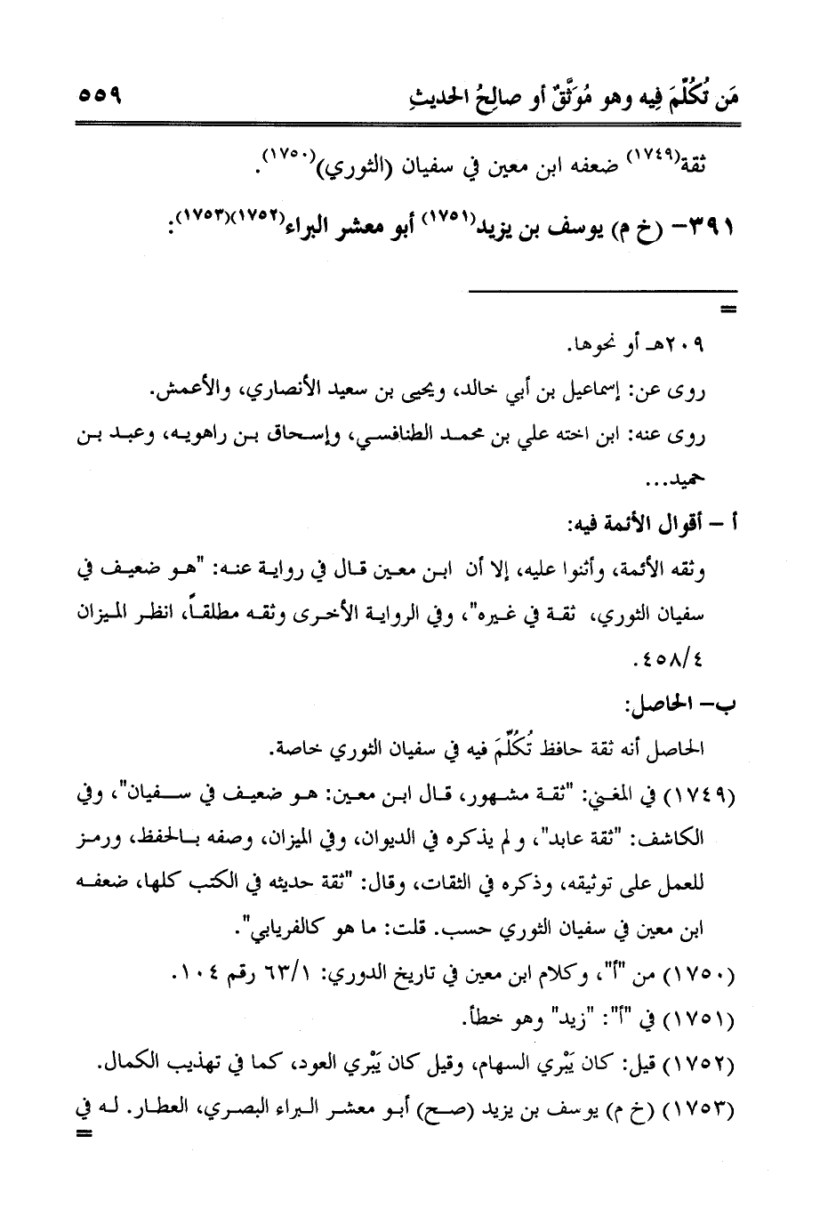 1 في المغني: "ثقة مشهور، قال ابن معين: هو ضعيف في سفيان"، وفي الكاشف: "ثقة عابد"، ولم يذكره في الديوان، وفي الميزان، وصفه بالحفظ، ورمز للعمل على توثيقه، وذكره في الثقات، وقال: "ثقة حديثه في الكتب كلها، ضعفه ابن معين في سفيان الثوري حسب. قلت: ما هو كالفريابي".