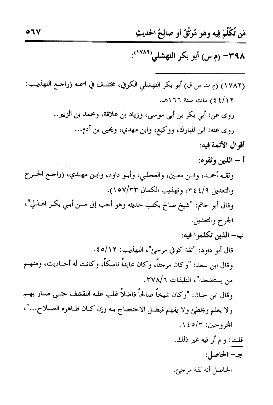 1 م ت س ق أبو بكر النهشلي الكوفي، مختلف في اسمه راجع التهذيب: 12/44 مات سنة 166هـ.