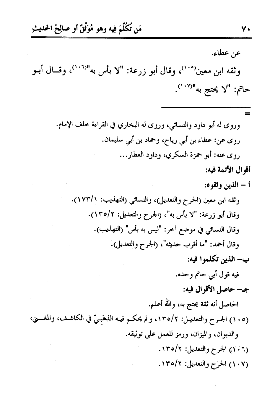 1 الجرح والتعديل: 2/135، ولم يحكم فيه الذهَبِيّ في الكاشف، والمغني، والديوان، والميزان، ورمز للعمل على توثيقه.