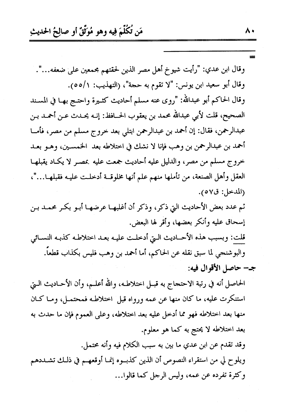 الحاصل أنه في رتبة الاحتجاج به قبل اختلاطه، والله أعلم، وأن الأحاديث التي استنكرت عليه، ما كان منها عن عمه ورواه قبل اختلاطه فمحتمل، وما كان منها بعد اختلاطه فهو مما أدخل عليه بعد اختلاطه، وعلى العموم فإن ما حدث به بعد اختلاطه لا يحتج به كما هو معلوم.