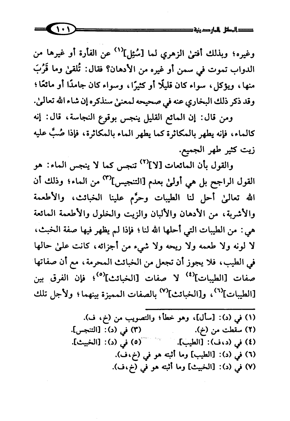 والقول بان المائعات [لا] (¬2) تنجس كما لا ينجس الماء: هو القول الراجح بل هي أولي بعدم [التنجيس] (¬3) من الماء؛ وذلك أن الله تعالى أحل لنا الطيبات وحرَّم علينا الخبائث، والأطعمة والأشربة، من الأدهان والألبان والزيت والخلول والأطعمة المائعة هي: من الطيبات التي أحلها الله لنا؛ فإذا لم يظهر فيها صفة الخبث، لا لونه ولا طعمه ولا ريحه ولا شيء من أجزائه، كانت على حالها في الطيب، فلا يجوز أن تجعل من الخبائث المحرمة، مع أن صفاتها صفات [الطيبات] (¬4) لا صفات [الخبائث] (¬5)؛ فإن الفرق بين [الطيبات] (¬6)، و [الخبائث] (¬7) بالصفات المميزة بينهما؛ ولأجل تلك