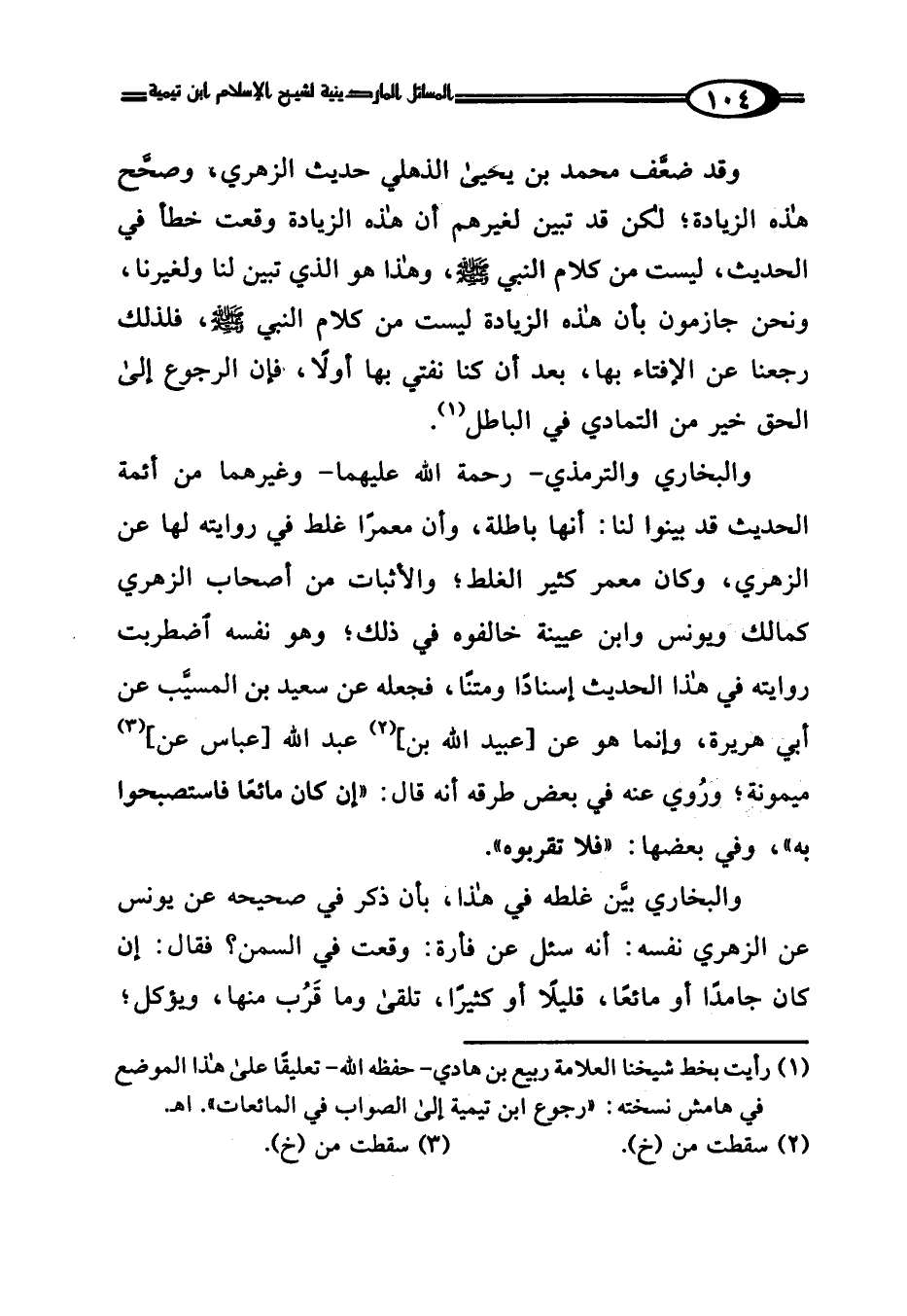 وقد ضعَّف محمد بن يحيى الذهلي حديث الزهري. وصحَّح هذه الزيادة، لكن قد تبين لغيرهم أن هذه الزيادة وقعت خطأ في الحديث، ليست من كلام النبي - صلى الله عليه وسلم -، وهذا هو الذي تبين لنا ولغيرنا، ونحن جازمون بأن هذه الزيادة ليست من كلام النبي - صلى الله عليه وسلم -، فلذلك رجعنا عن الإفتاء بها، بعد أن كنا نفتي بها أولًا، "فإن الرجوع إلى الحق خير من التمادي في الباطل (¬1).