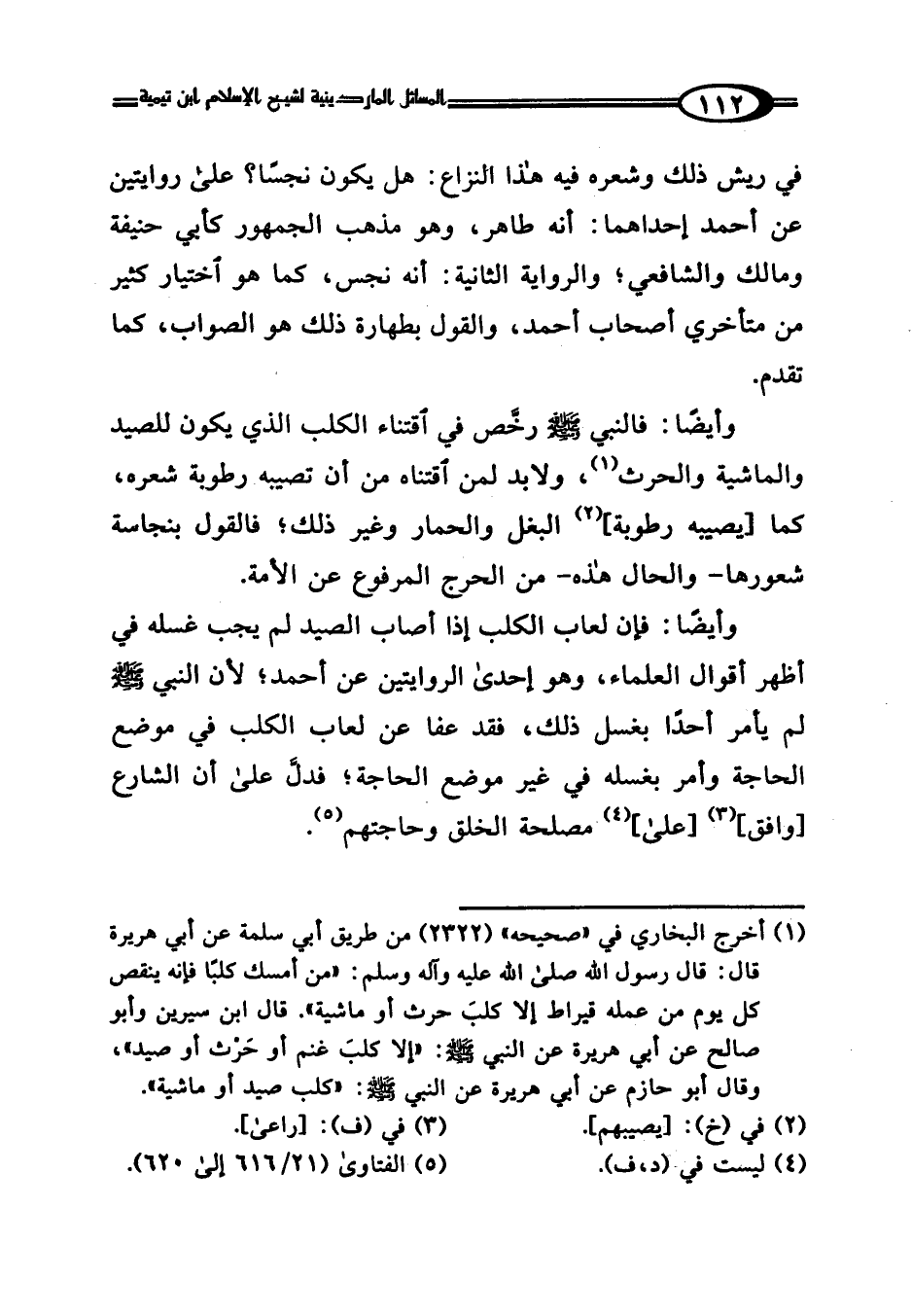 وأيضًا: فإن لعاب الكلب إذا أصاب الصيد لم يجب غسله في أظهر أقوال العلماء، وهو إحدى الروايتين عن أحمد؛ لأن النبي - صلى الله عليه وسلم - لم يأمر أحدًا بغسله ذلك، فقد عفا عن لعاب الكلب في موضع الحاجة وأمر بغسل في غير موضع الحاجة؛ فدلَّ على أن الشارع [وافق] (¬3) [على] (¬4) مصلحة الخلق وحاجتهم (¬5).