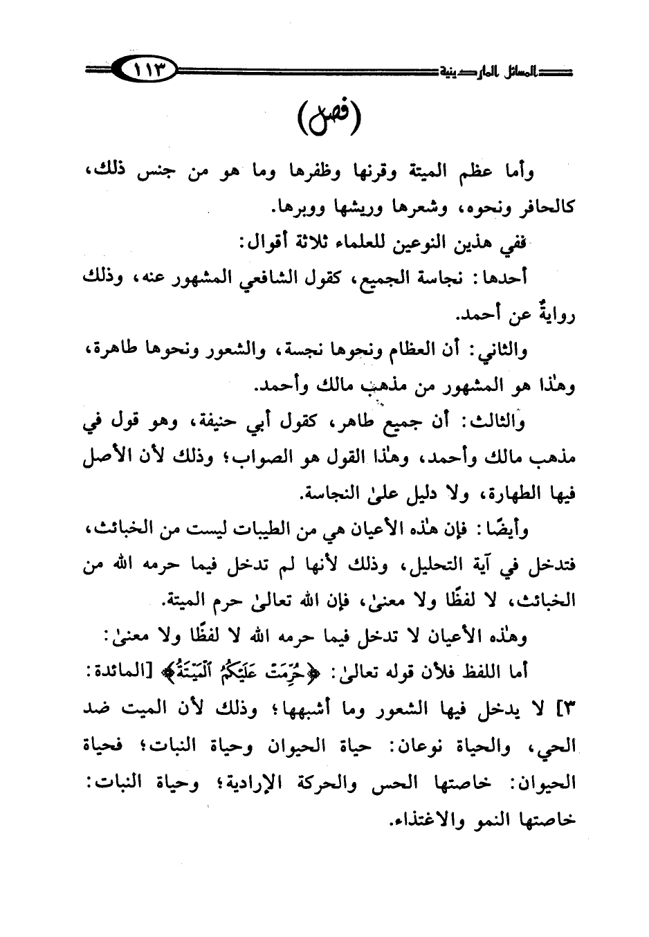 أما اللفظ فلأن قوله تعالى: {حُرِّمَتْ عَلَيْكُمُ الْمَيْتَةُ} [المائدة: 3]، لا يدخل فيها الشعور وما أشبها؛ وذلك لأن الميت ضد الحي، والحياة نوعان: حياة الحيوان وحياة النبات؛ فحياة الحيوان: خاصتها الحس والحركة الإرادية؛ وحياة النبات: خاصتها النمو والاغتذاء.