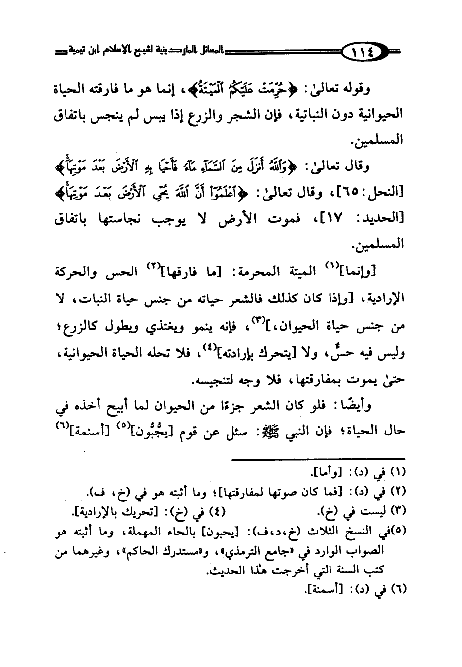 وقوله تعالى: {حُرِّمَتْ عَلَيْكُمُ الْمَيْتَةُ}، إنما هو ما فارقته الحياة الحيوانية دون النباتية، فإن الشجر والزرع إذا يبس لم ينجس باتفاق المسلمين.